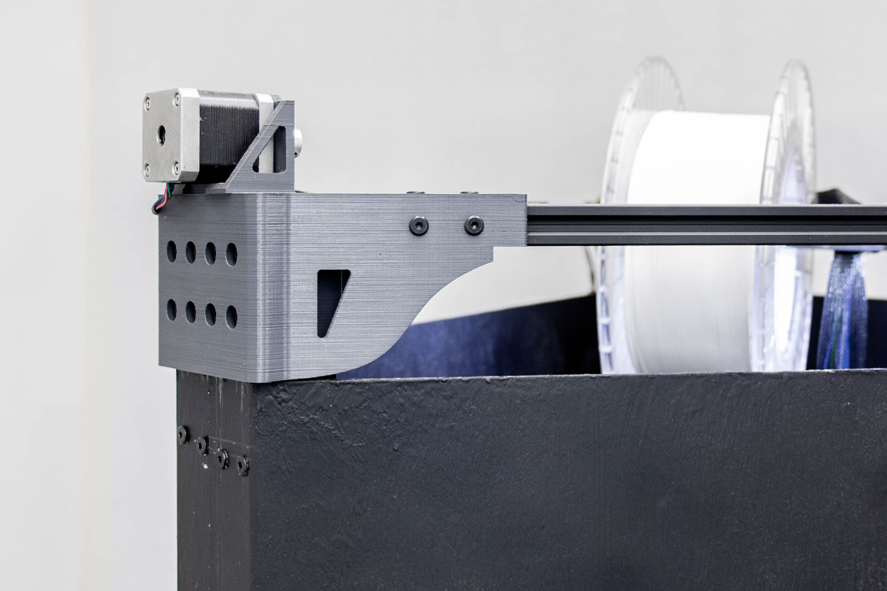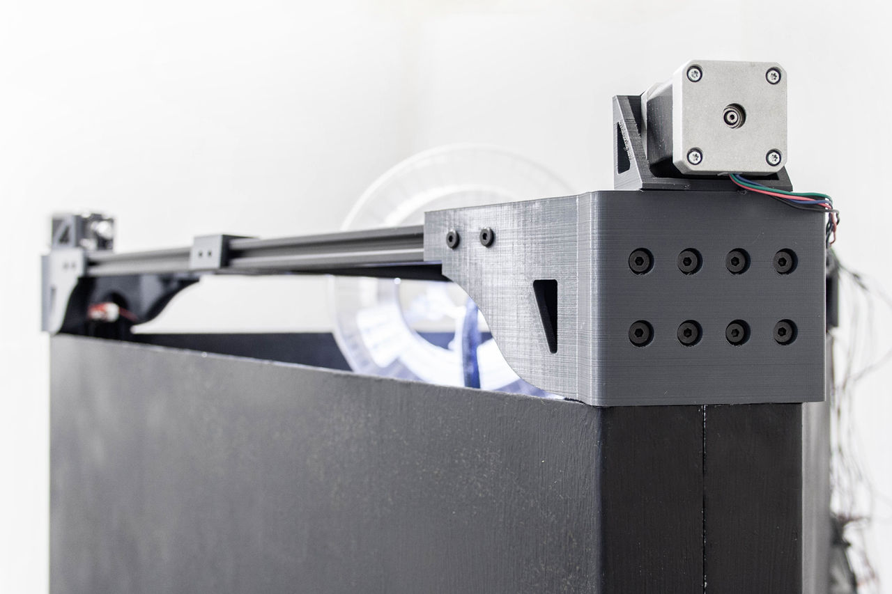 In terms of software, instead of Marlin, the most popular option for controlling 3D printers, Klipper was used, which is also an open-source CNC firmware that allows faster calculations of movements through an ARM-based computer. In the usual configurations (Marlin), there is a microcontroller (AVR) which calculates the movements and drives the stepper motors; in contrast to the Klipper case the motion calculations are performed by a much more capable device (ARM), which then distributes individually the kinematic signals through the microcontroller. This arrangement allows for faster calculations and therefore leads to faster and higher accuracy movement. In addition, Klipper allows the use of multiple slave microcontrollers, thus allowing the connection and control of a large number of stepper motors, a feature that can be utilised in various experimental digital manufacturing methods, expanding the capabilities of the machine.