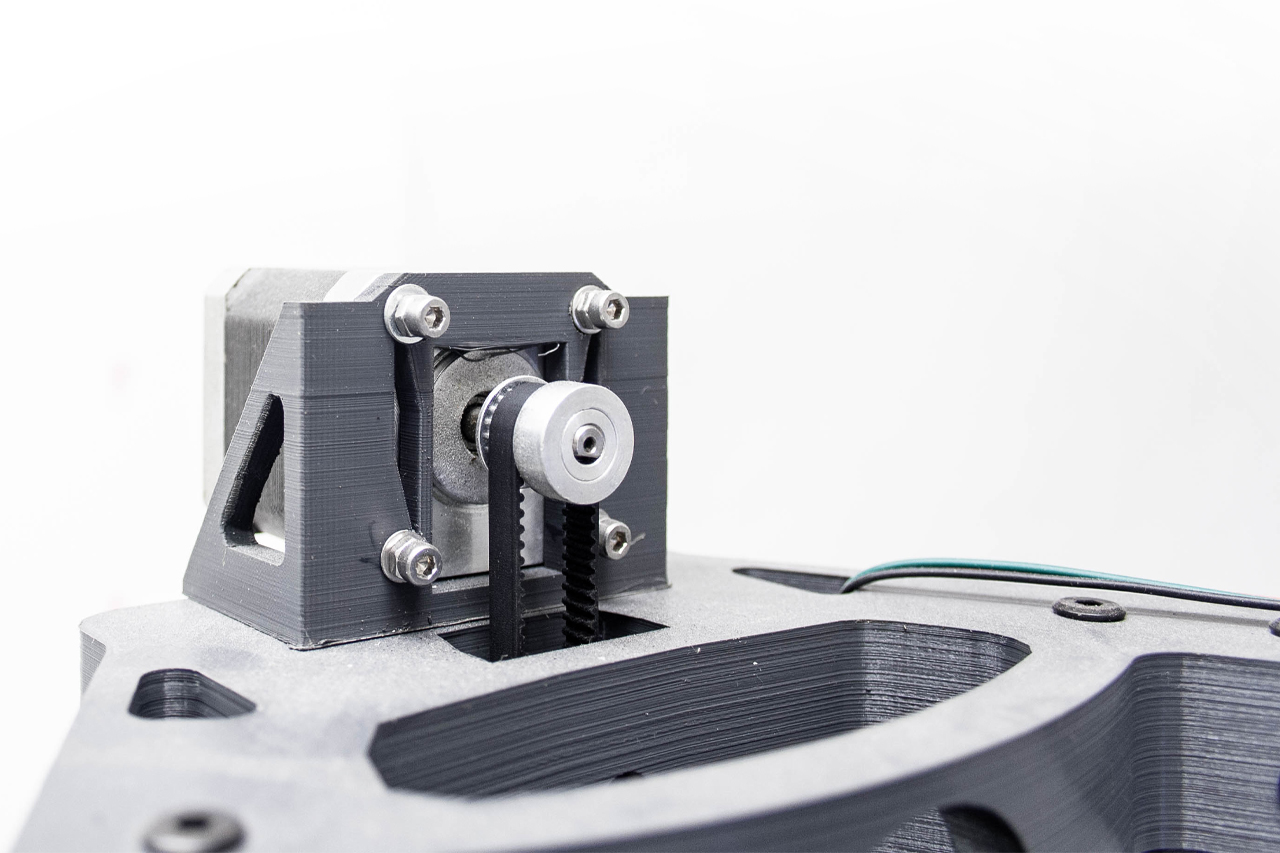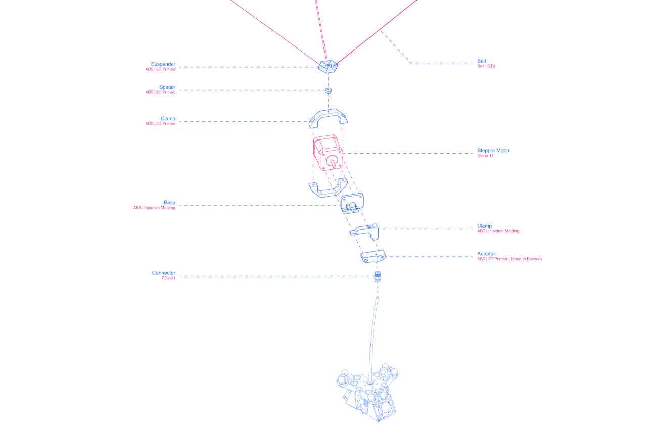 Το σύστημα κίνησης που επιλέχθηκε είναι αυτό της Delta αρχιτεκτονικής, καθώς η επιλογή αυτή εμφάνιζε πλεονεκτήματα έναντι των υπολοίπων συστημάτων κίνησης (Cartesian και Core XΥ). Τα βασικότερα πλεονεκτήματα ήταν η αναλογία μεταξύ της μέγιστης επιφάνειας εκτύπωσης και της επιφάνειας κάλυψης του μηχανήματος, η οποία στους εκτυπωτές που υπακούουν στο Cartesian σύστημα κίνησης είναι αρκετά μεγάλη. Θα μπορούσε να είχε προτιμηθεί η υιοθέτηση του συστήματος Core XY αλλά μια τέτοια επιλογή θα οδηγούσε σε μία αύξηση της πολυπλοκότητας των μηχανικών μερών, η οποία είναι περιττή και είναι πιθανόν να παρουσιάσει προβλήματα στην πρόσδεση διαφορετικών κεφαλών για τη χρήση άλλων μεθόδων. Το σύστημα Delta αποτελεί την απλούστερη δομή, η οποία προσδίδει στο μηχάνημα ευελιξία στη χρήση του και επιτρέπει την πρόσδεση πολλαπλών κεφαλών, διευκολύνοντας έτσι τον πειραματισμό και συγχρόνως παρέχει τη δυνατότητα χρήσης συστημάτων τα οποία δεν έχουν προδιαγραφεί εξαρχής.