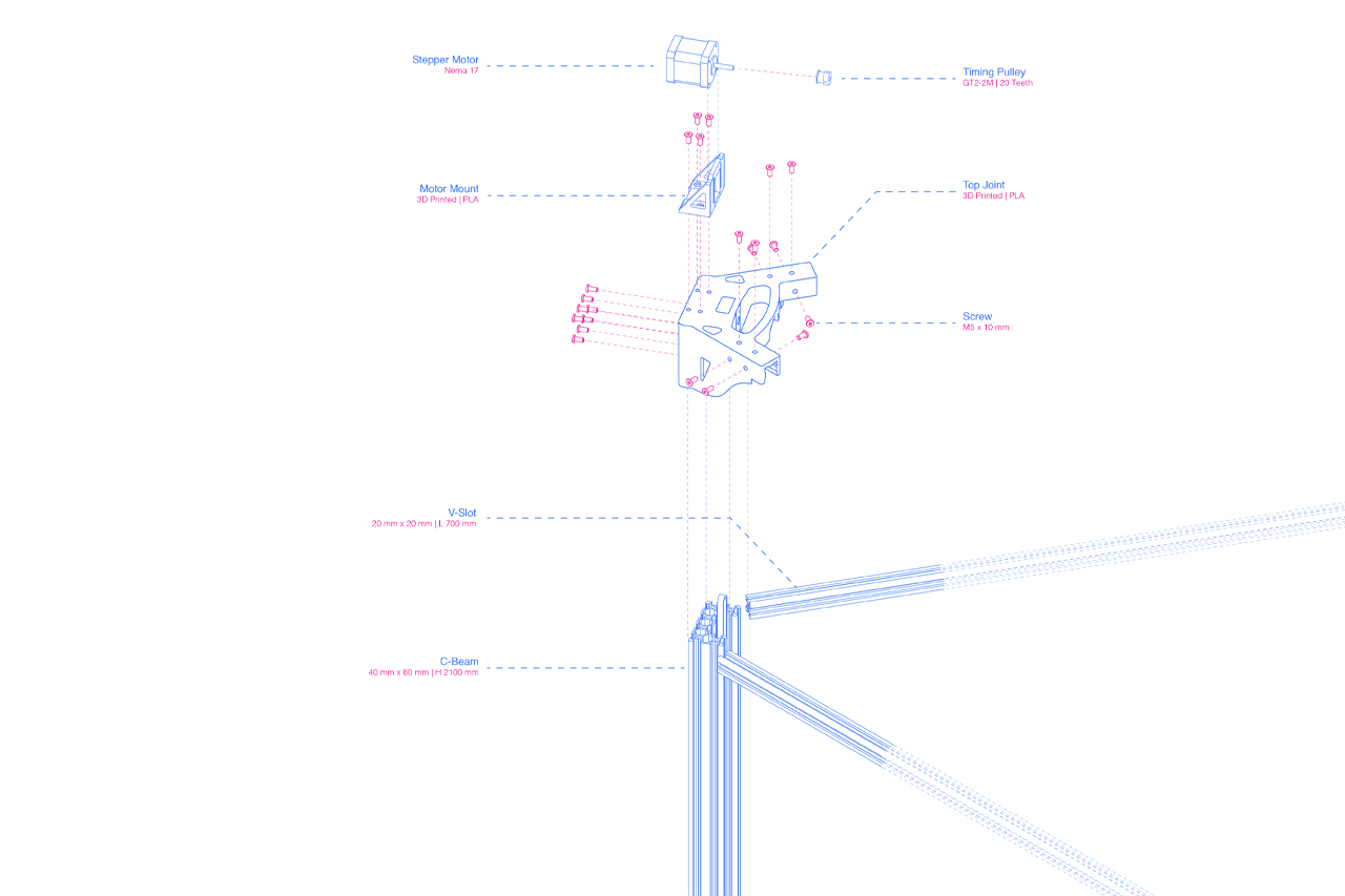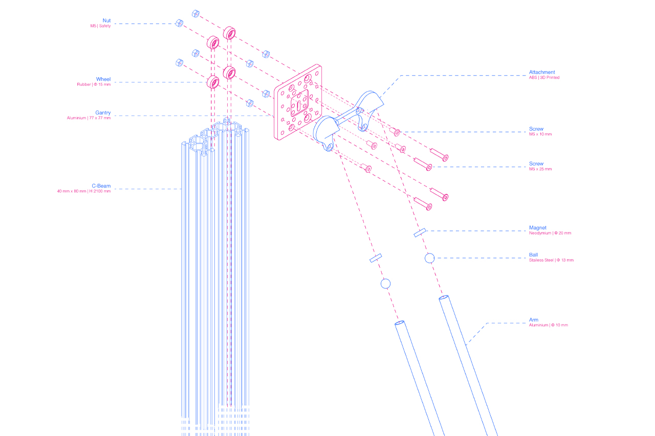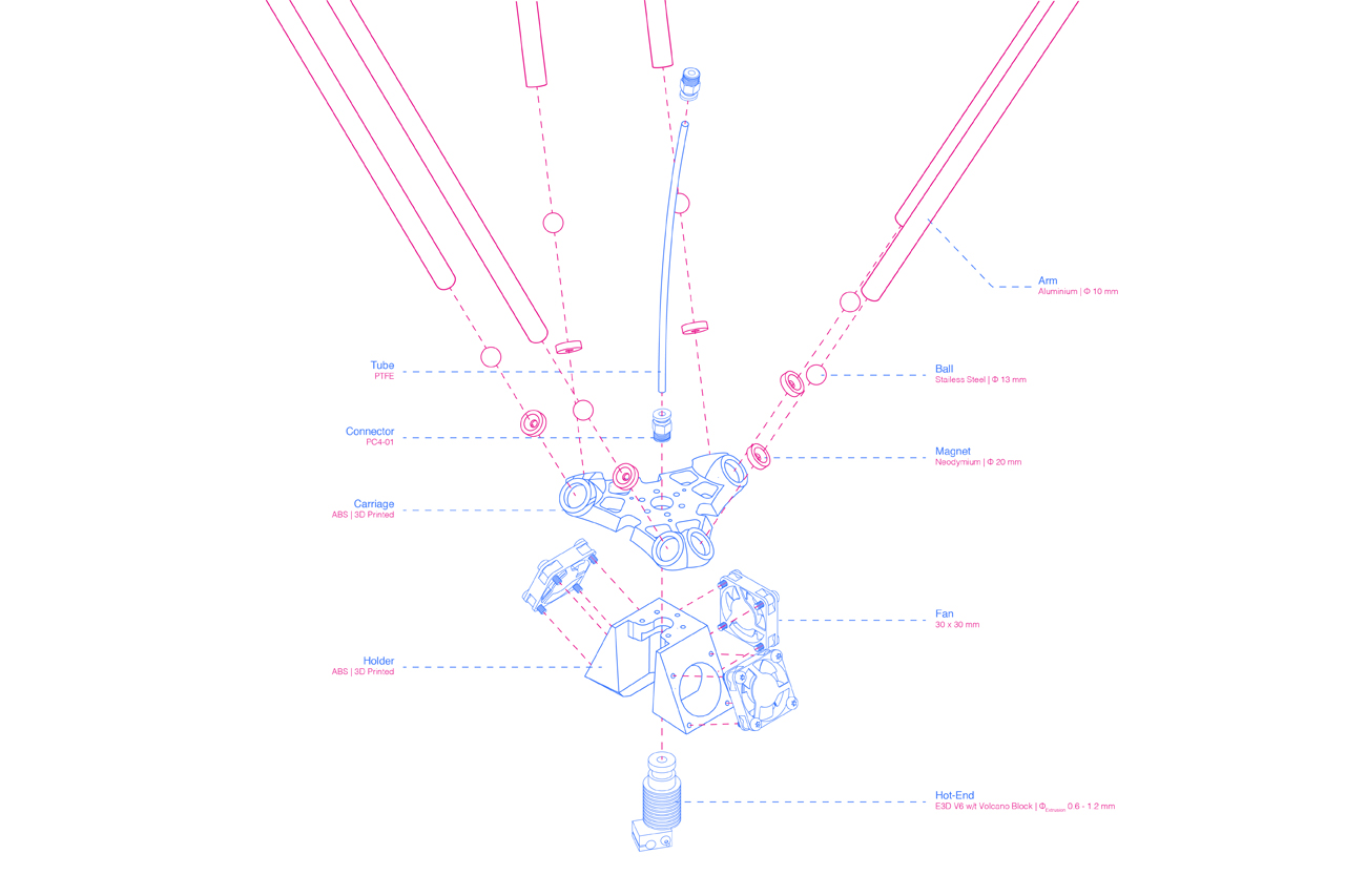 The design of Δ_Apparatus was separated into two distinct stages. The first concerned the basic structure of the machine, while the second was focused on the most complex mechanical parts. The construction of the frame was constructed using aluminum elements (C-Beam & V-Slots) as they provide maximum stability without increasing the weight of the structure, while at the same time using them ensures rapid and easy standardisation of the various variants of the construction, on a real scale. Aluminium was chosen as a material, and in the case of the kinetic arms, for the construction of which were used profiles of circular cross section, which lead to metallic spheres. The connectors of these components are parts that required adaptation to the needs arising from the various tests and machine requirements. So, based on these needs, they were individually designed and produced by ABS using a three-dimensional printer. The design of the carriage was based on the nature and purpose of the machine, meaning its easy removal and subsequent replacement by someone else. To achieve the above goal, neodymium magnets were used in carrier associations with the drive arms. This union allows the free movement of the carrier over the spherical ends of the drive arms while at the same time making it possible to easily switch between the carriers of the different terminal tools. It is configured in such a way that the different material propulsion mechanisms are suspended from the three gantries in order to minimise the distance between them and the terminal tools used in each case.