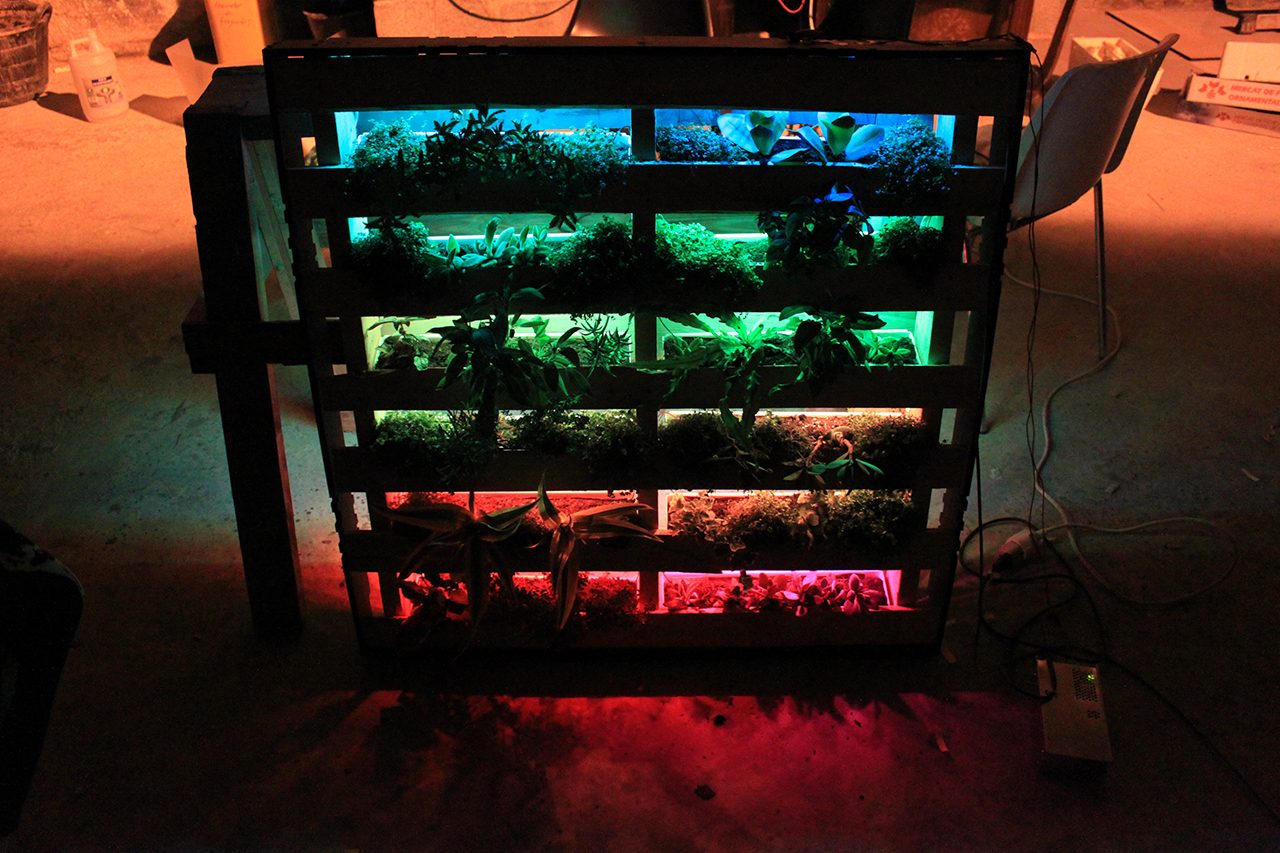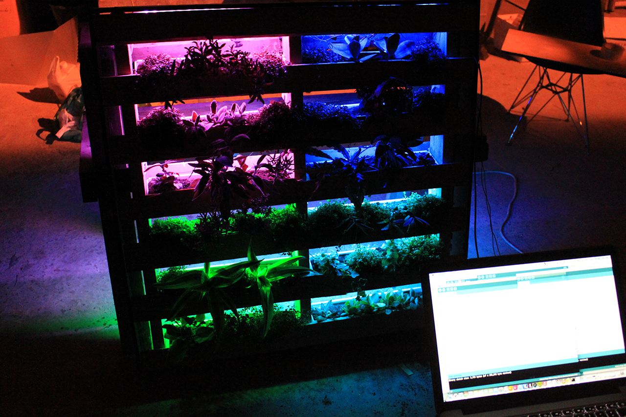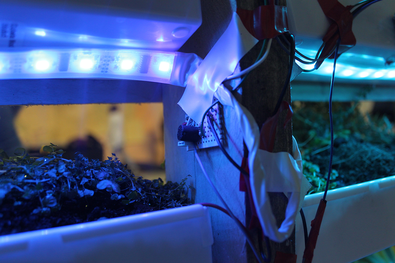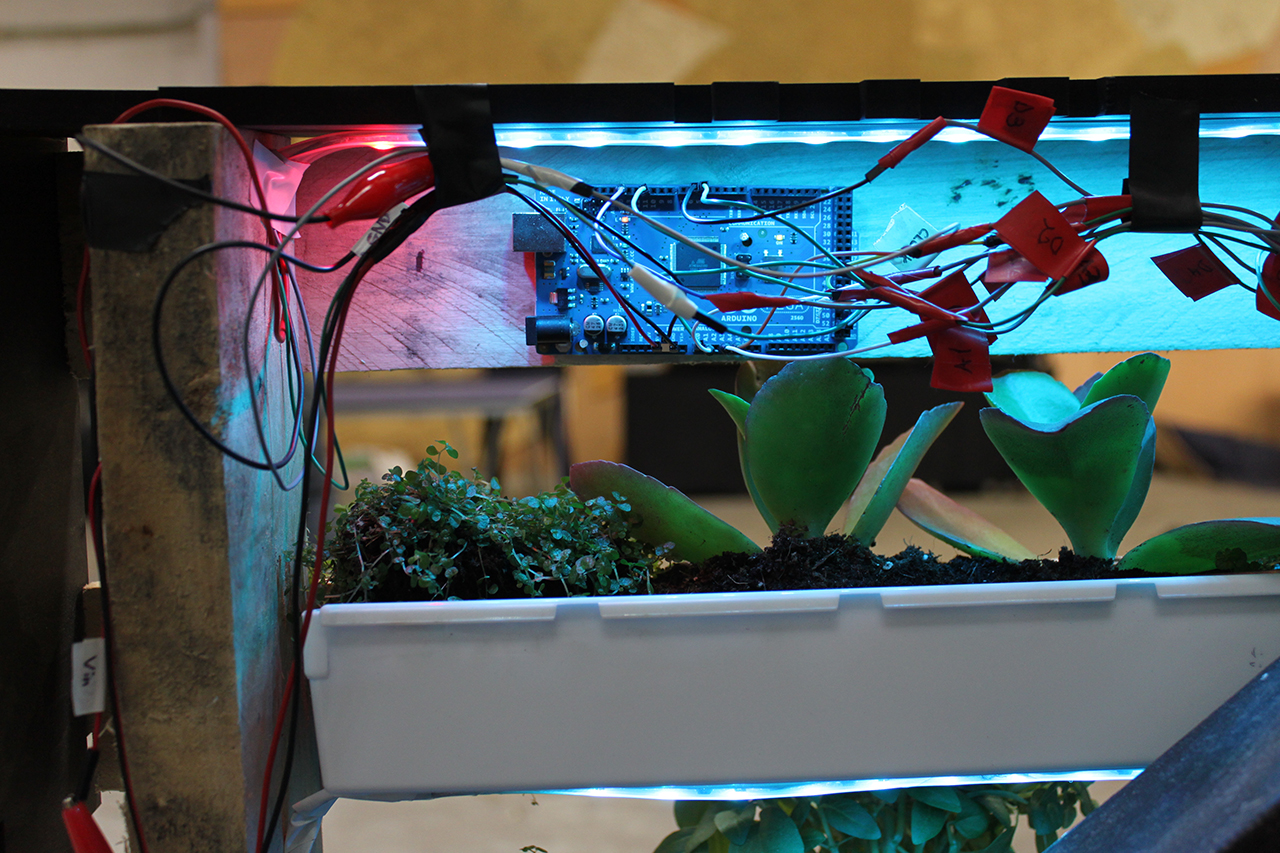 Built on a reused pallet, PhytoSense is comprised of 12 planters fastened to the back of the pallet, allowing plants to grow through the exposed gaps. A copper plate lines the inside of each planter and is attached to an SFCS. Four SFCS sensors control the four quarters of the pallet independently. Depending on which quadrant is touched, addressable LEDs gradually fade from green to red. The absence of touch returns the LEDs to their previous color. The whole prototype is controlled by one 16-bit Arduino Mega, which reads the sensor values in real time. PhytoSense uses a variety of local plants and their ability to measure capacitance differs depending on various factors, such as leaf length, water retention, and soil moisture. The many and different values led us to simplify the interaction.