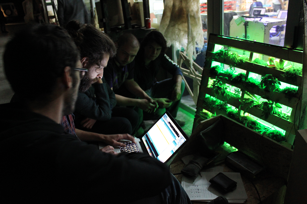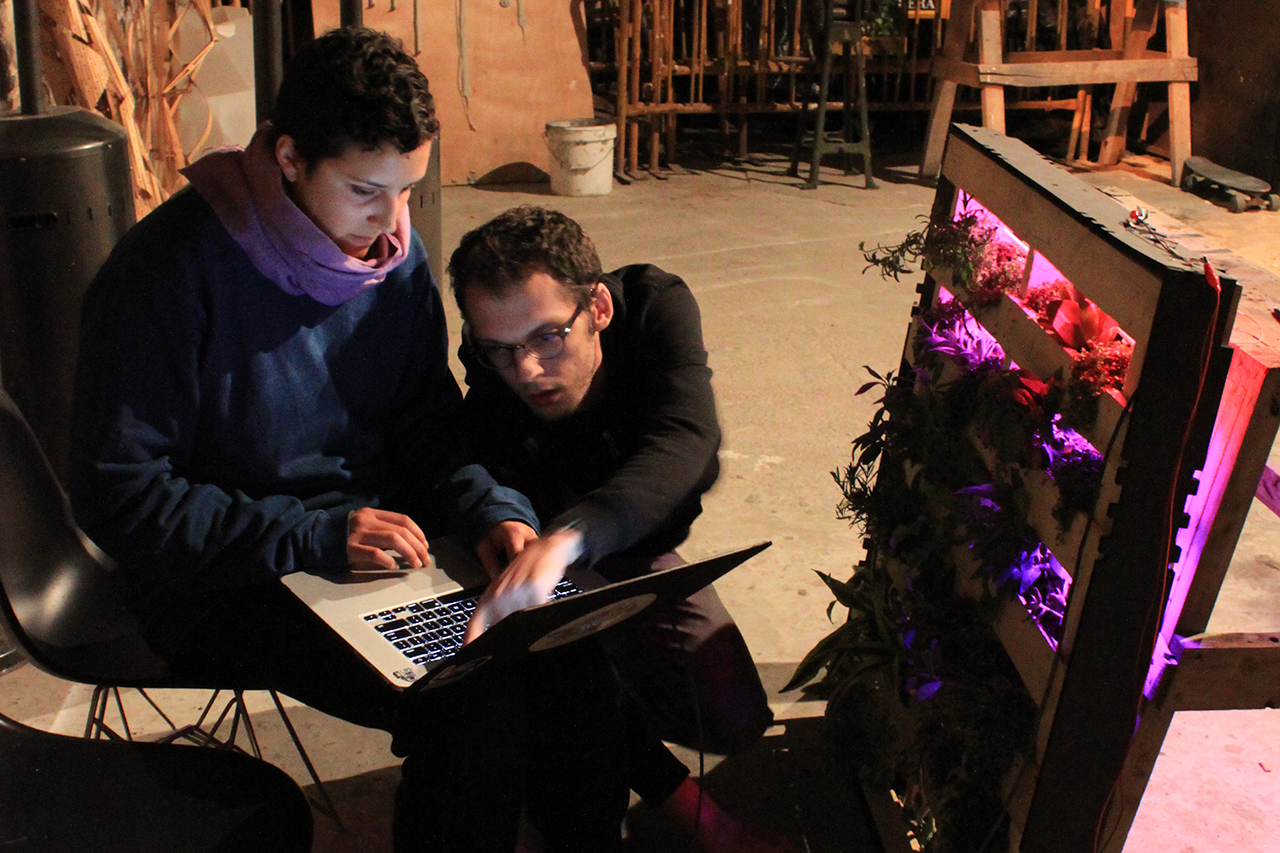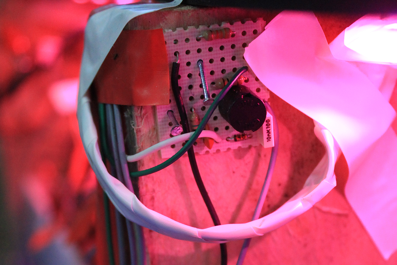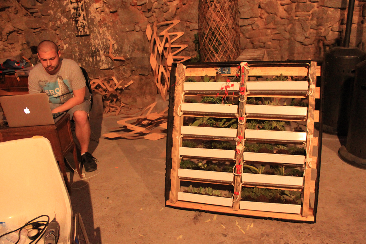 Built on a reused pallet, PhytoSense is comprised of 12 planters fastened to the back of the pallet, allowing plants to grow through the exposed gaps. A copper plate lines the inside of each planter and is attached to an SFCS. Four SFCS sensors control the four quarters of the pallet independently. Depending on which quadrant is touched, addressable LEDs gradually fade from green to red. The absence of touch returns the LEDs to their previous color. The whole prototype is controlled by one 16-bit Arduino Mega, which reads the sensor values in real time. PhytoSense uses a variety of local plants and their ability to measure capacitance differs depending on various factors, such as leaf length, water retention, and soil moisture. The many and different values led us to simplify the interaction.