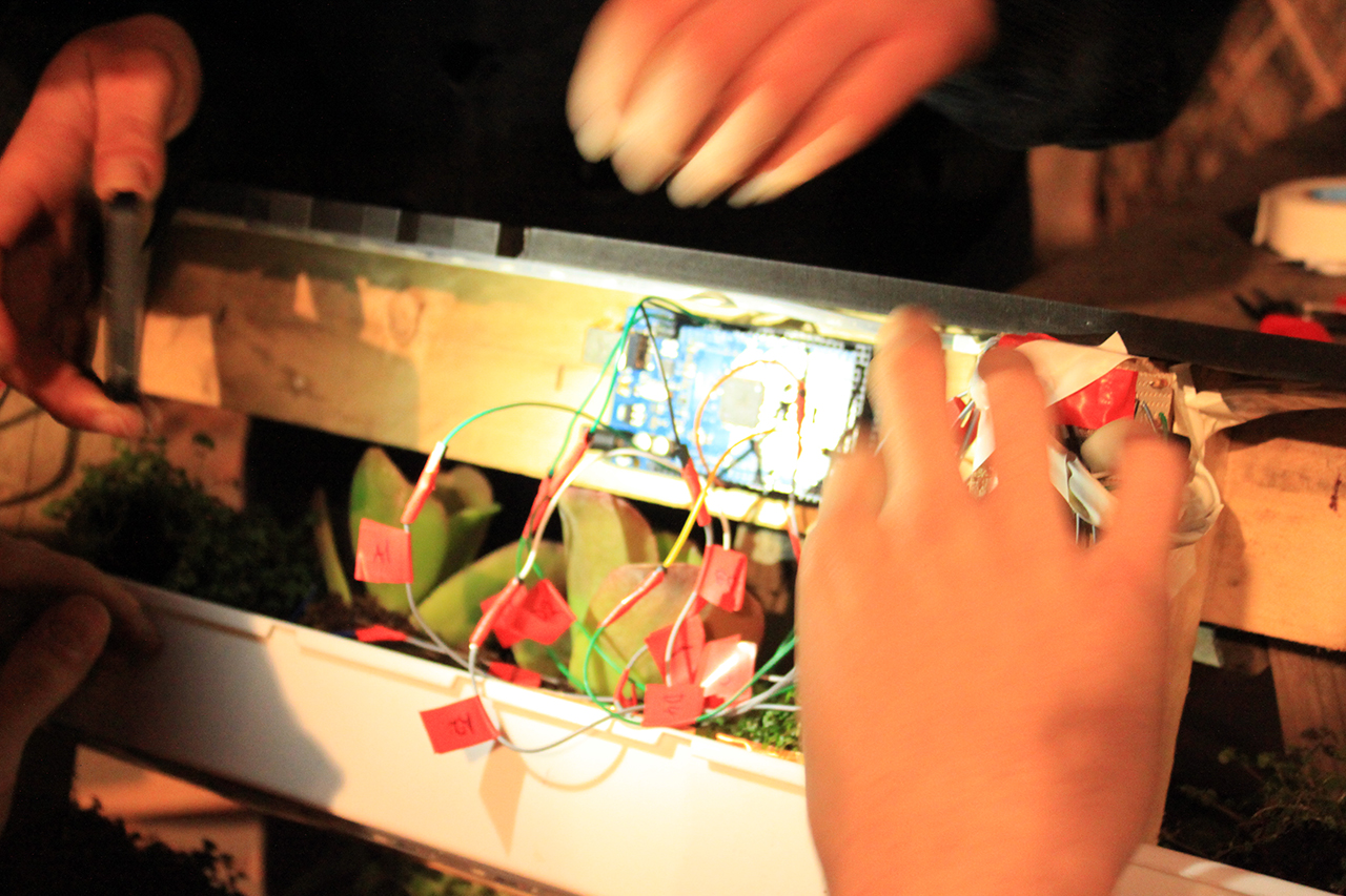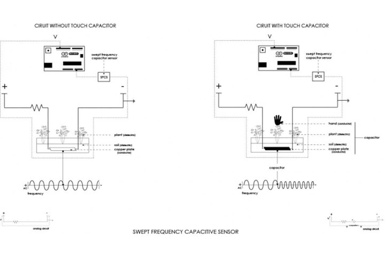 Τhe circuit senses changes in voltage and capacitance from current being run through a swept frequency capacitive sensor (SFCS) attached to a conductor (copper plate) buried in a dielectric (planter and plant). With the circuit on this state, current runs freely through it until it finds ground and nothing is sensed. Yet, when a second conductor (human hand) approaches or touches the plant, a capacitor is made between the copper plate and the hand, with the plant acting as its dielectric inert material. Introducing the capacitor to the AC circuit changes the frequency of the voltage and current after it goes through the capacitor, a change in frequency that is measured by the SFCS.