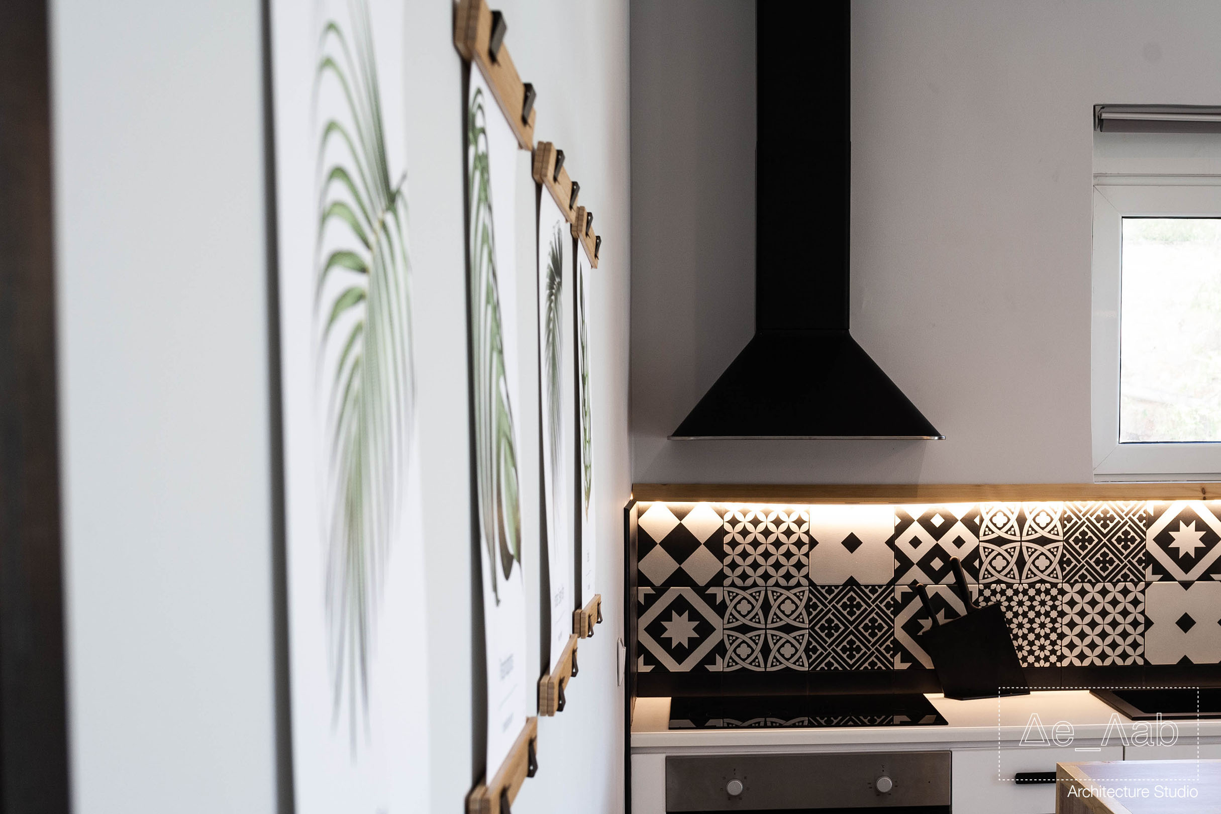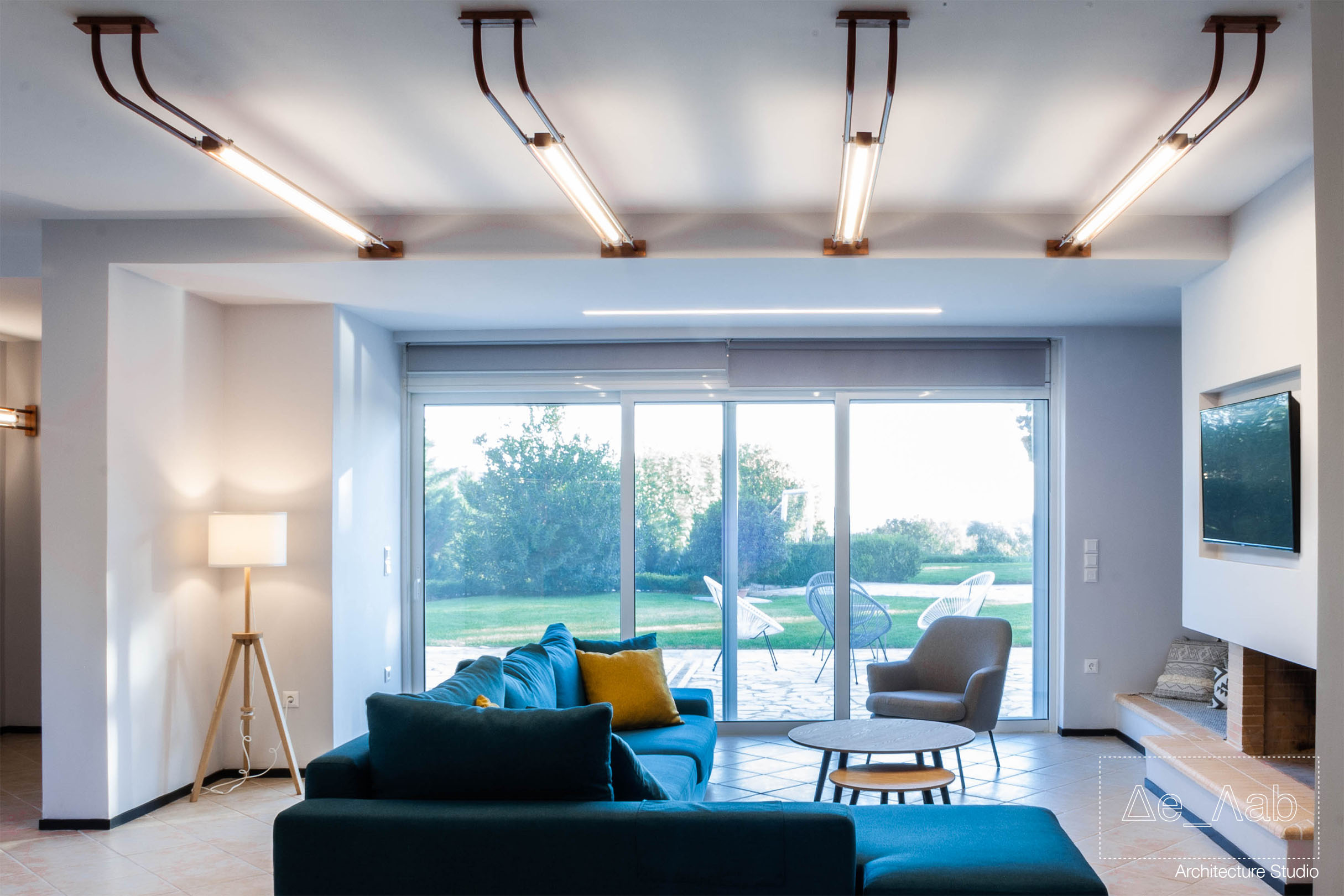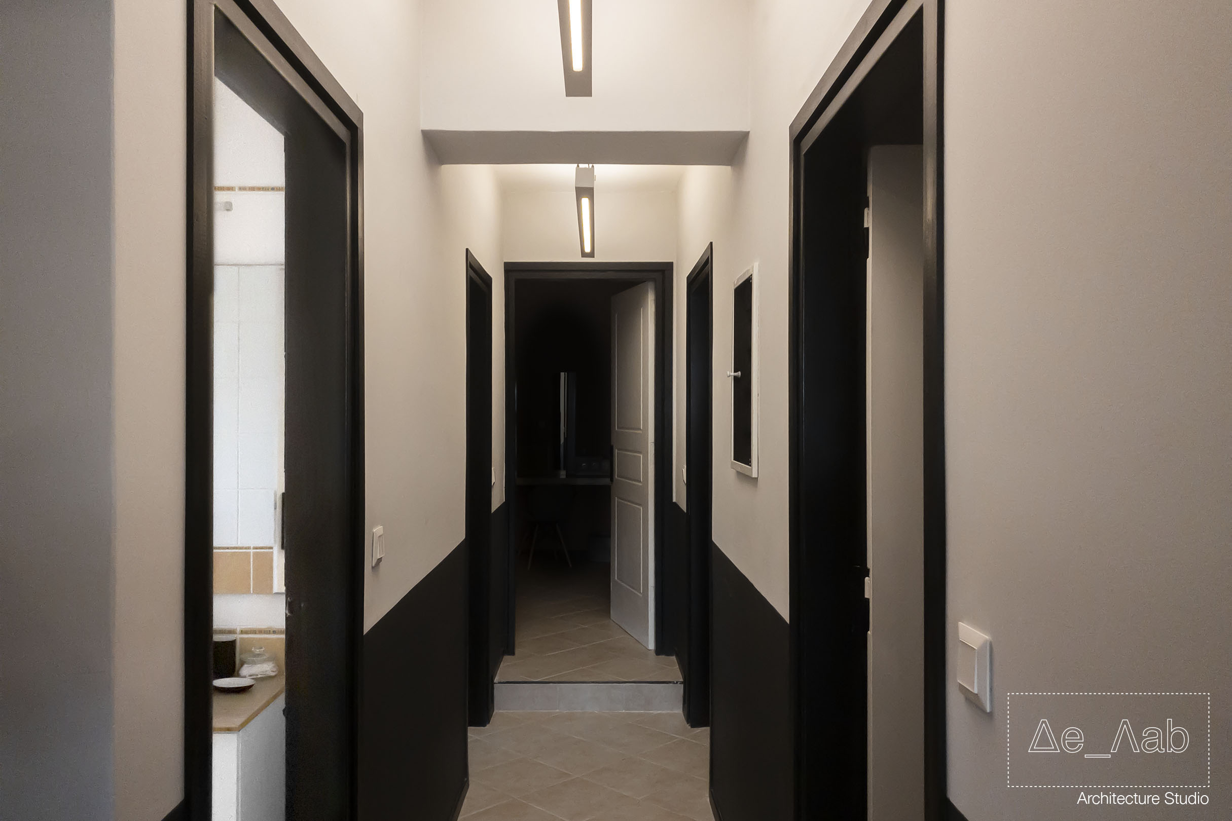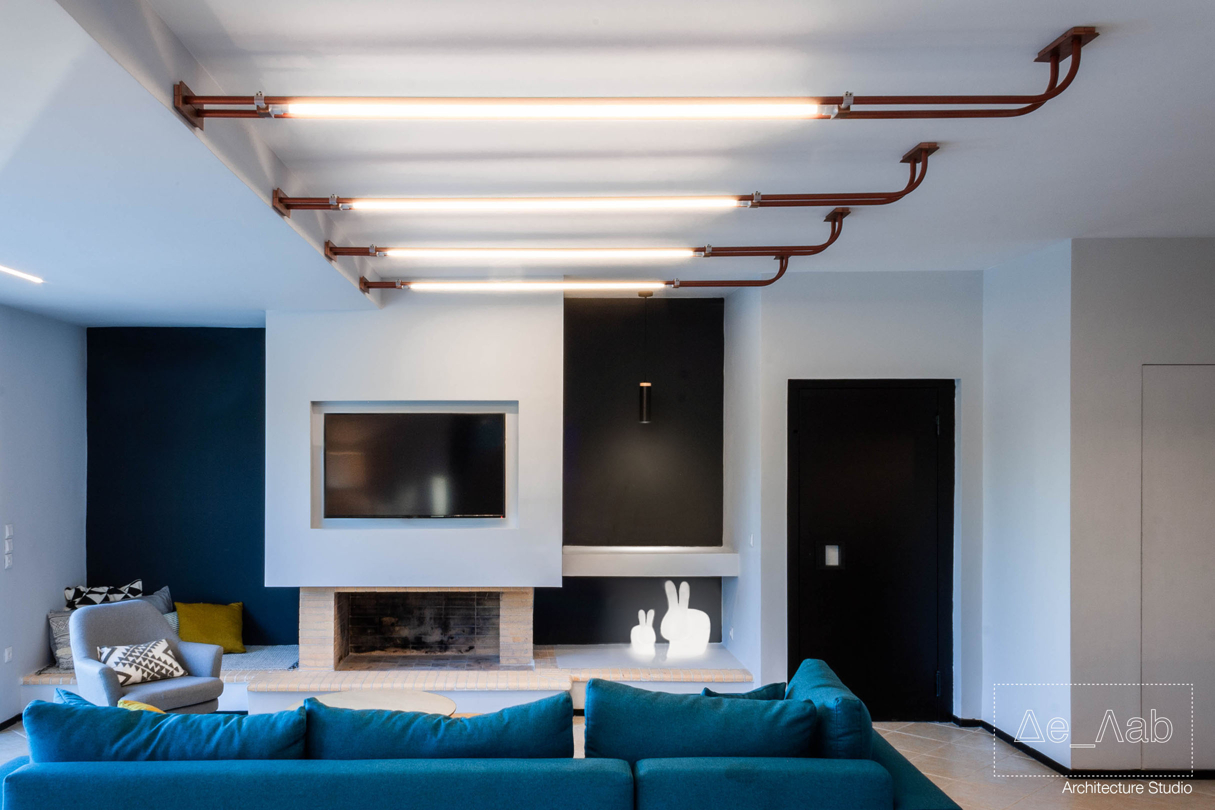 Δεδομένου πως ο χώρος είναι υπόσκαφος και τα μοναδικά μεγάλα ανοίγματα βρίσκονται στην μπροστινή όψη της κατοικίας δόθηκε ιδιαίτερη σημασία στον φωτισμό των επιμέρους χώρο ώστε να είναι επαρκής και ομοιογενής σε όλη την επιφάνεια των δωματίων.