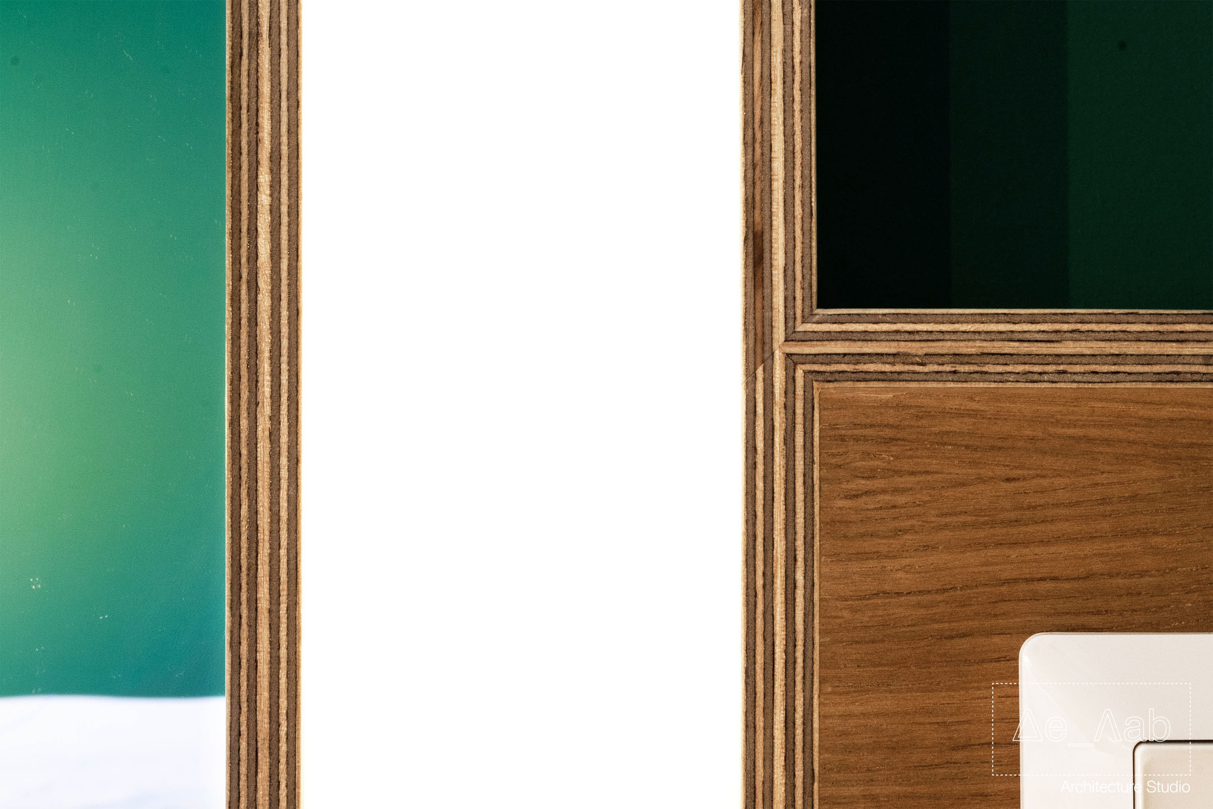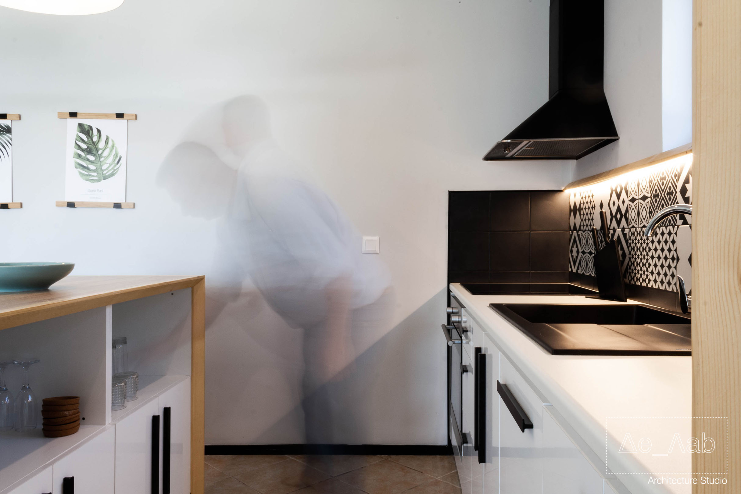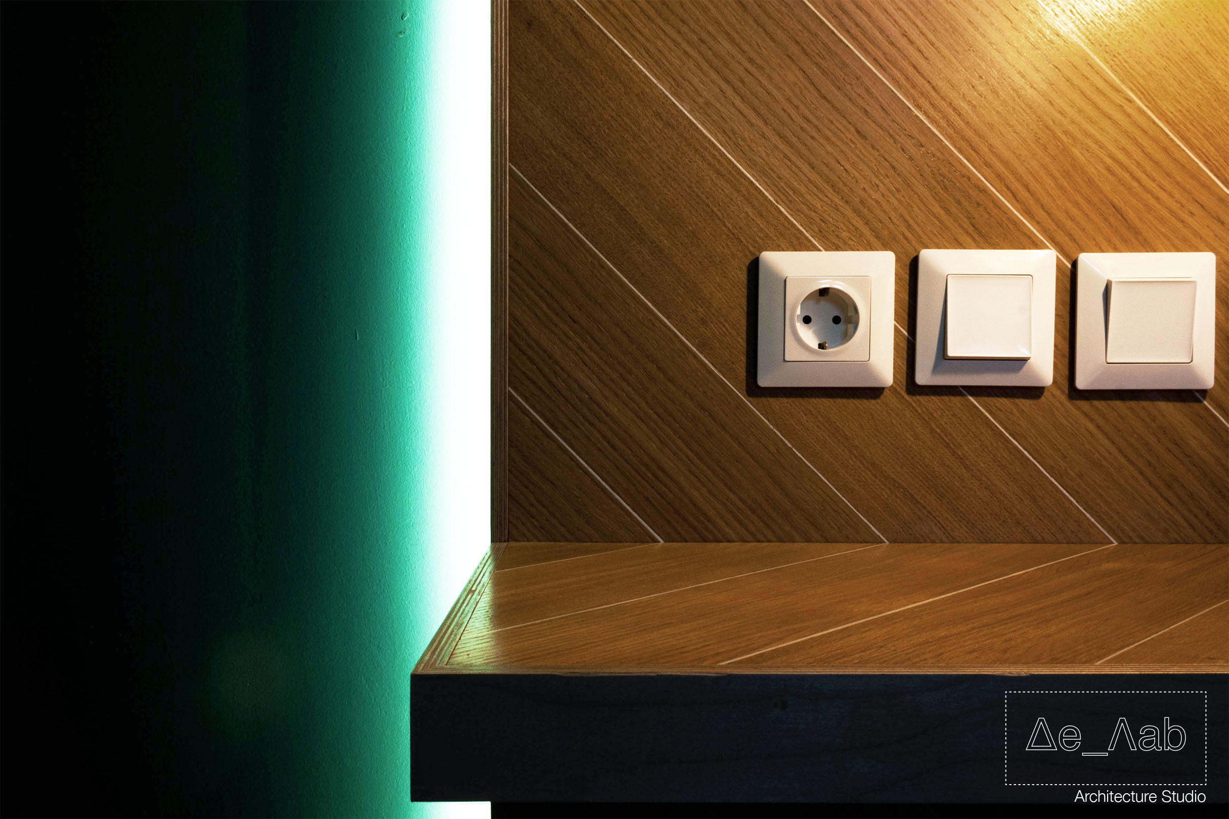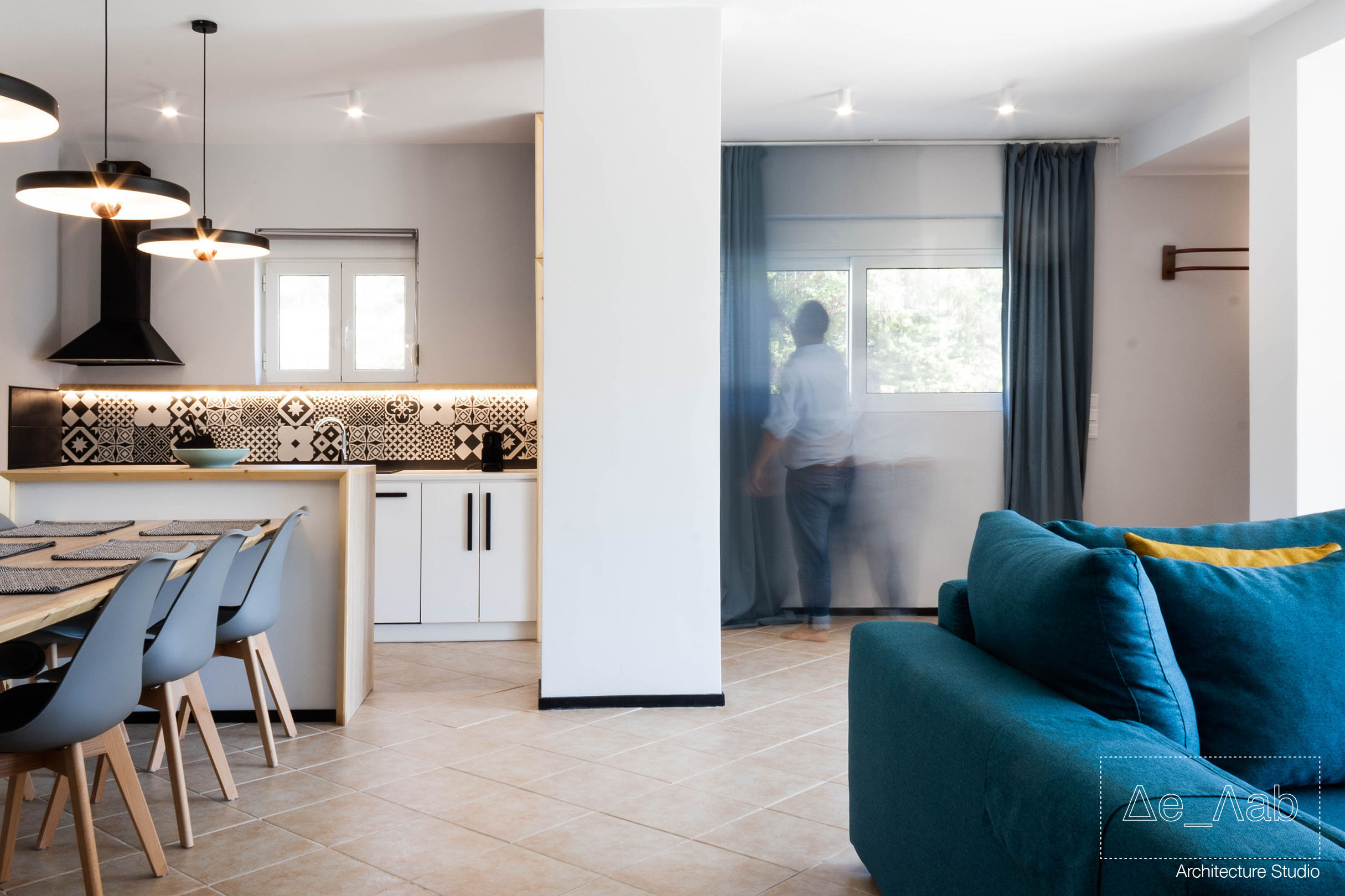 Δεδομένου πως ο χώρος είναι υπόσκαφος και τα μοναδικά μεγάλα ανοίγματα βρίσκονται στην μπροστινή όψη της κατοικίας δόθηκε ιδιαίτερη σημασία στον φωτισμό των επιμέρους χώρο ώστε να είναι επαρκής και ομοιογενής σε όλη την επιφάνεια των δωματίων.