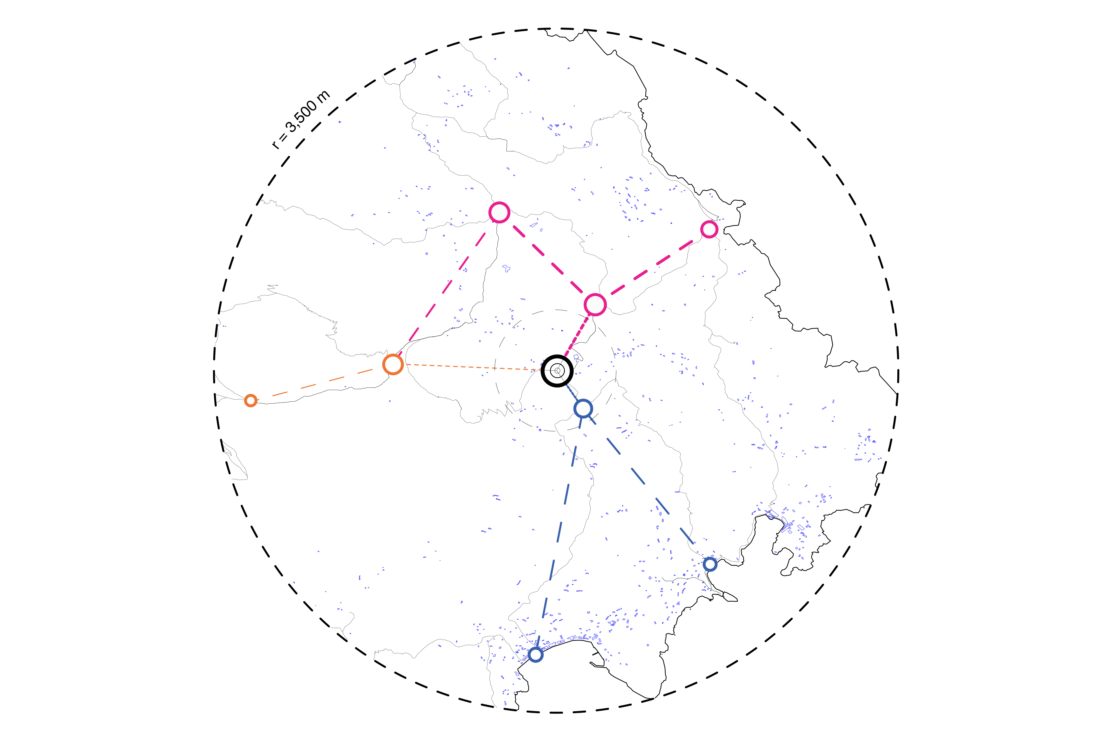 The new spatial reality is placed at the intersection points of the network of paths. The central body of the frame consists of the connection of wooden elements with a parameterised fibre weaving to the upper horizontal surface. The size of the openings is determined on the basis of a custom method of assessing the significance of flow of the paths based on the social filters of the different user groups under consideration.