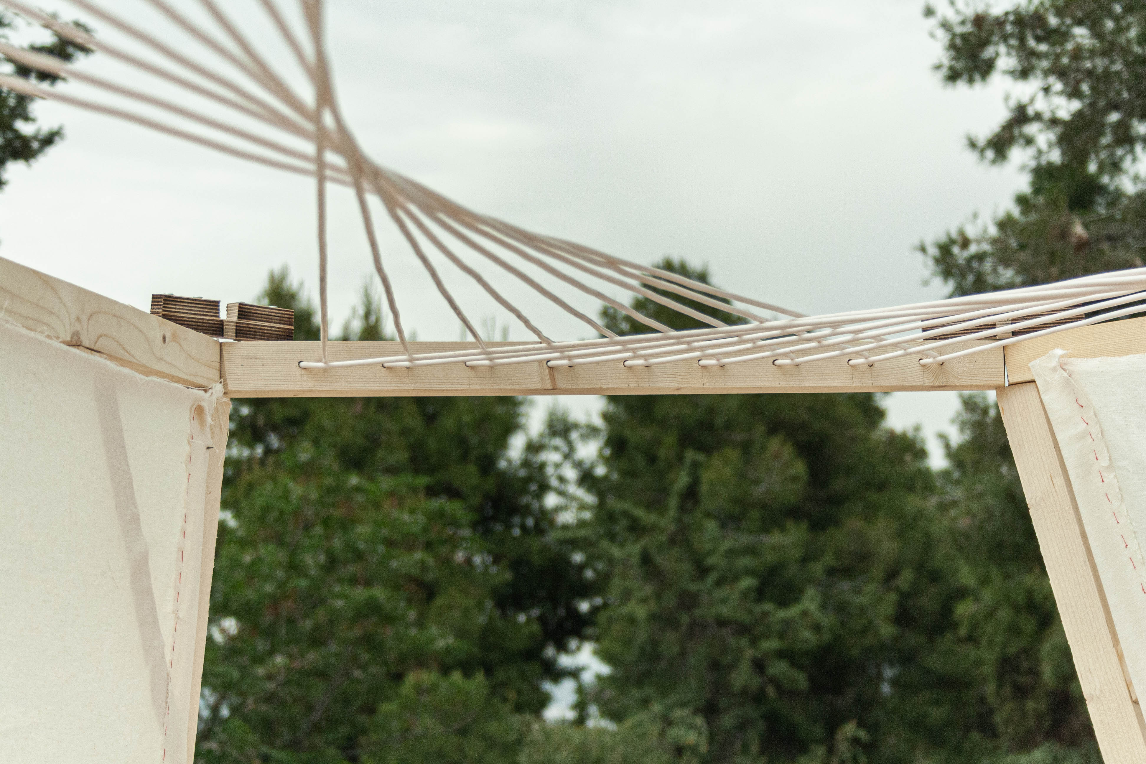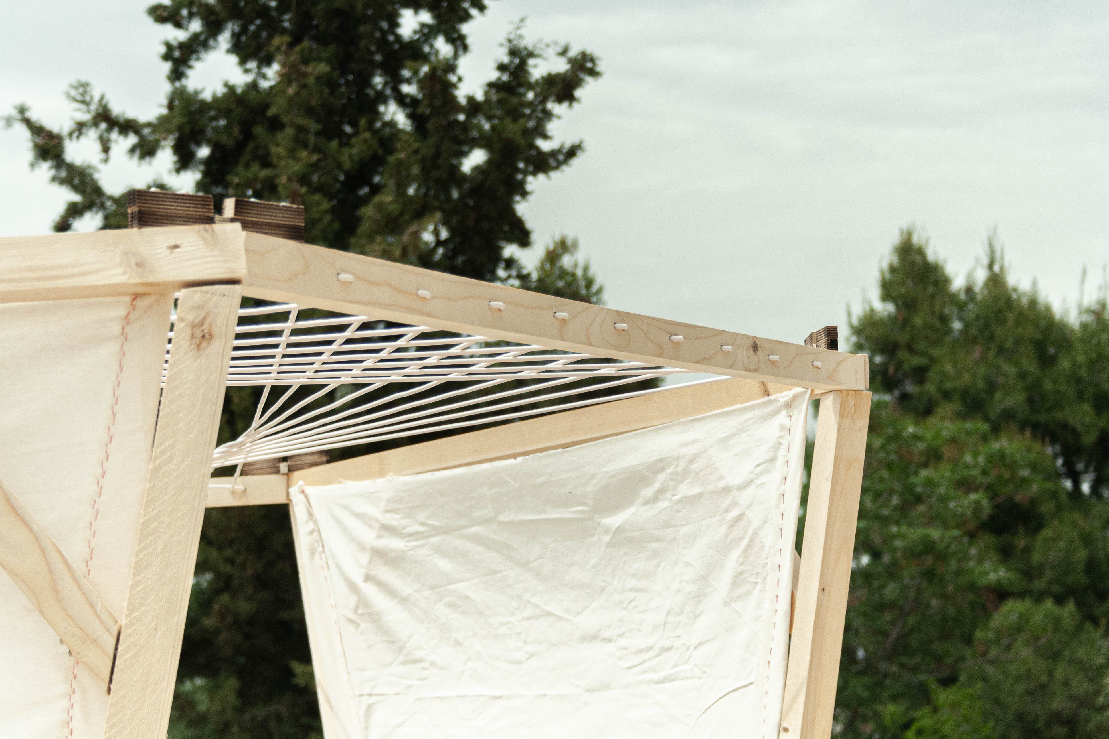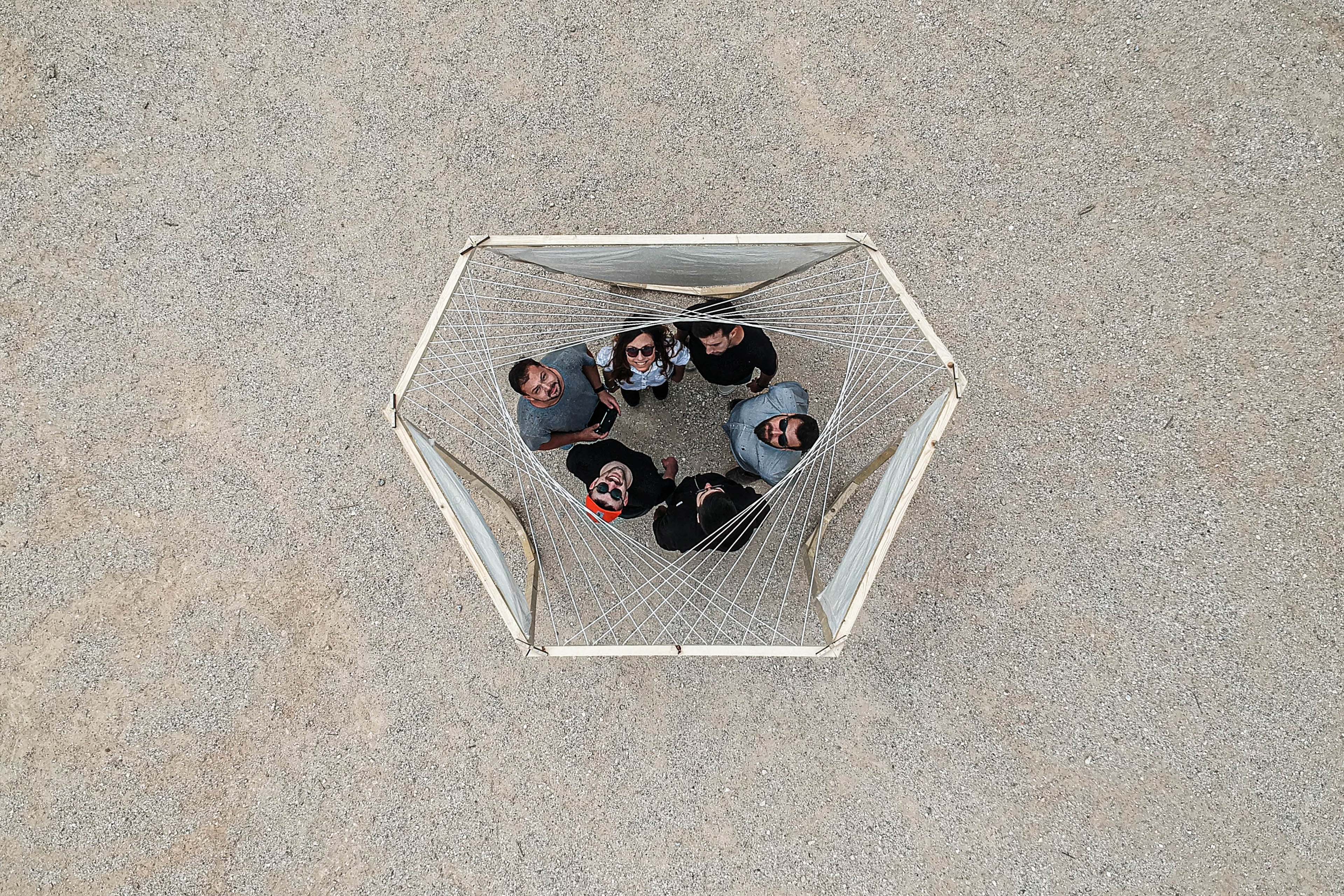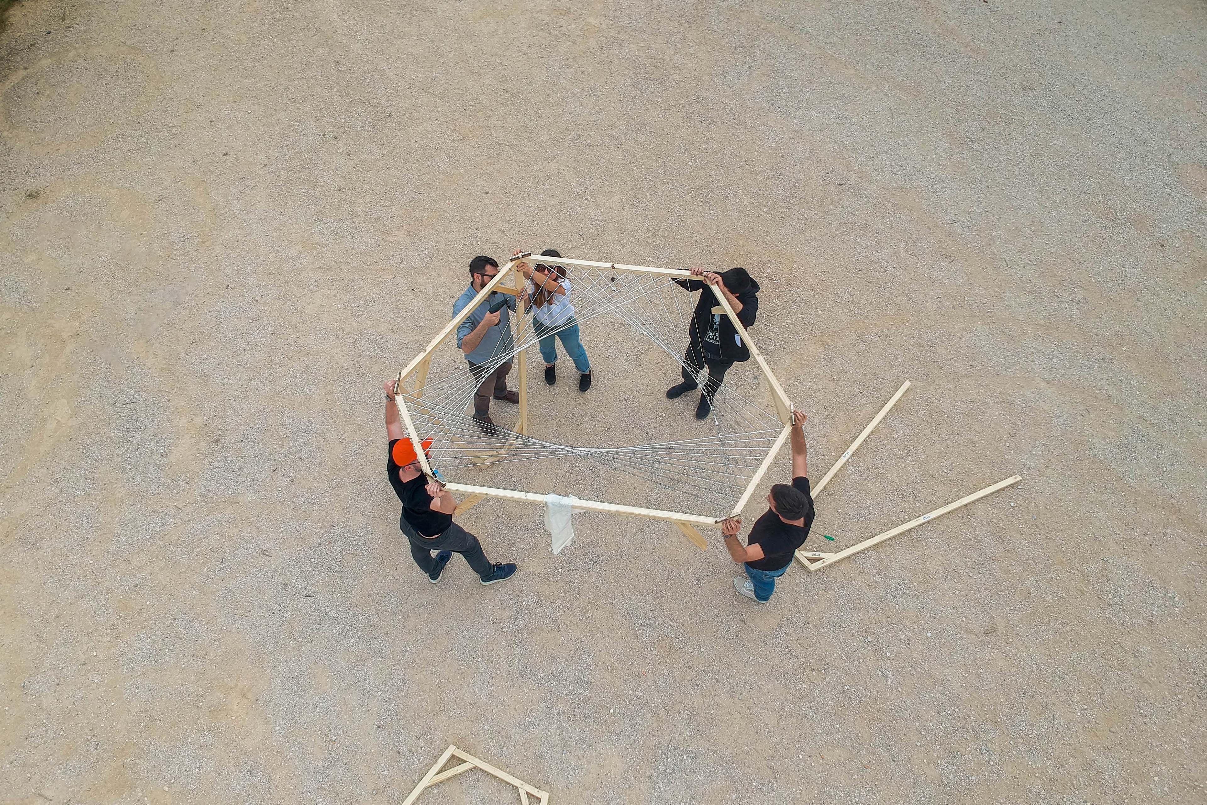 The final volume is constructed from trapezoidal shaped faces with triangular details. The inner space of a hexagonal top is crowned by a patio resulting from continuous fibre weaving, which are designed to differentiate shading of the structure due to the longitudinal edges of the yarn. As a whole, the construction combines numerous features to create a spatial matrix of social fusion of the different user groups of the paths.
