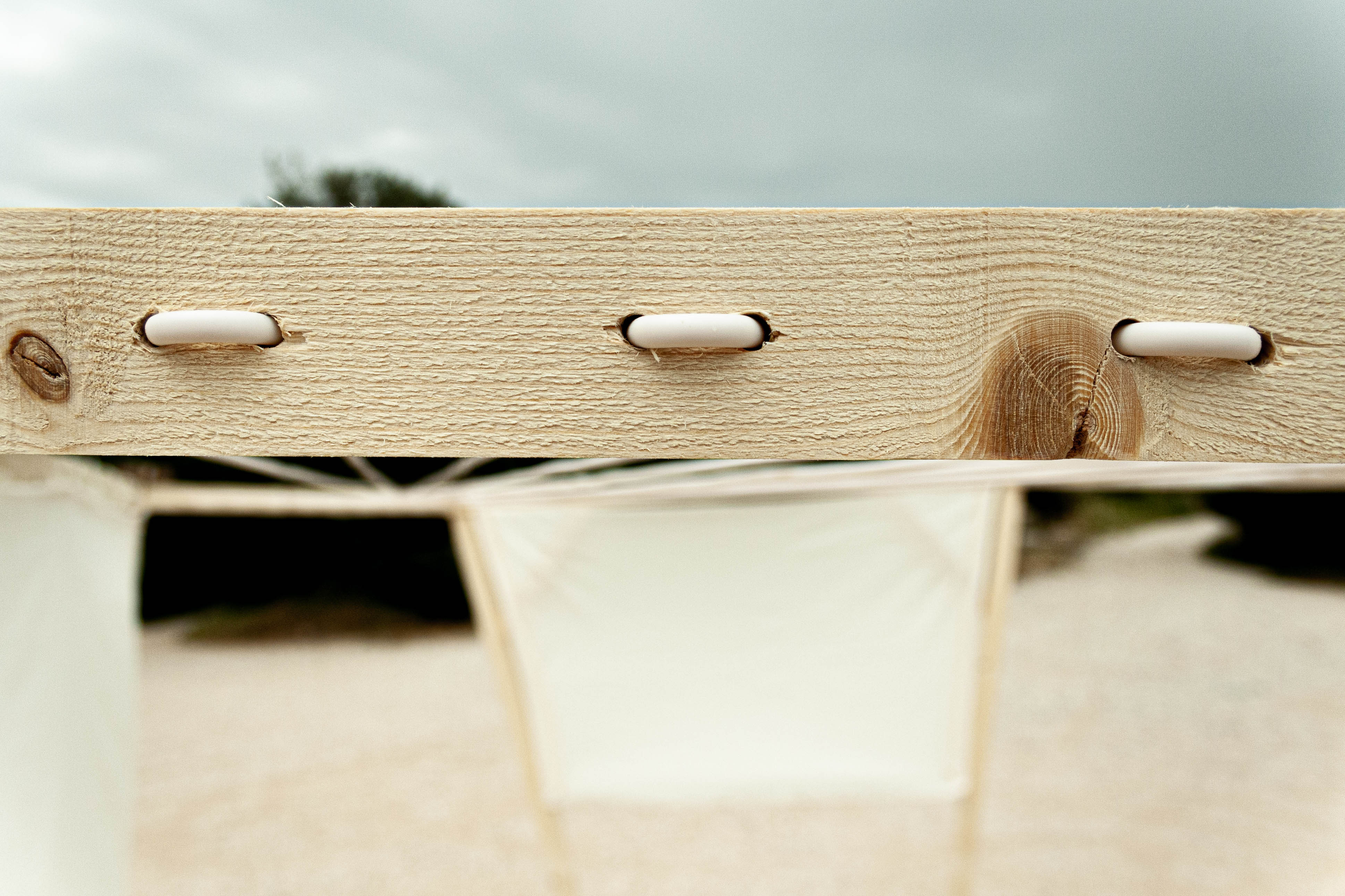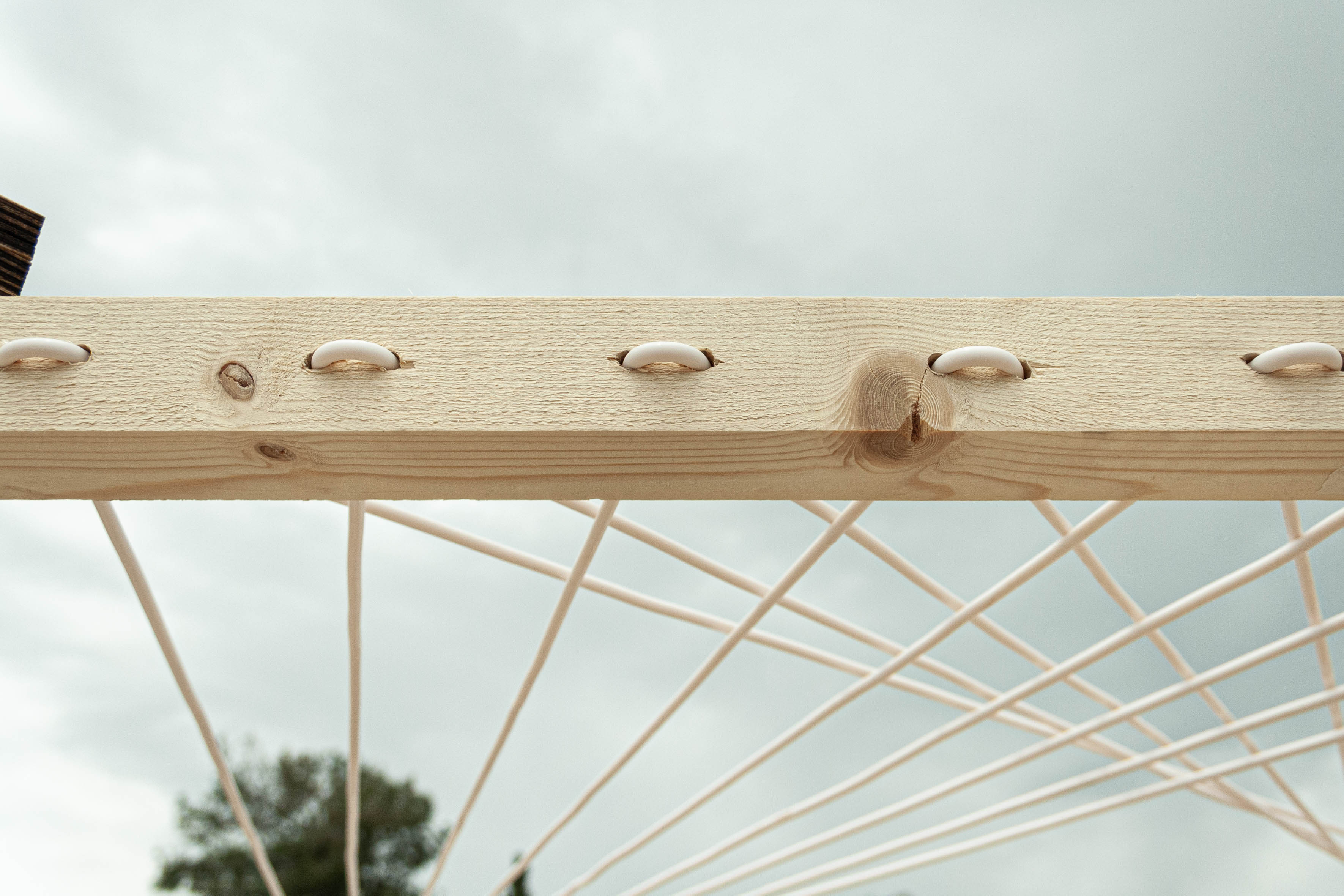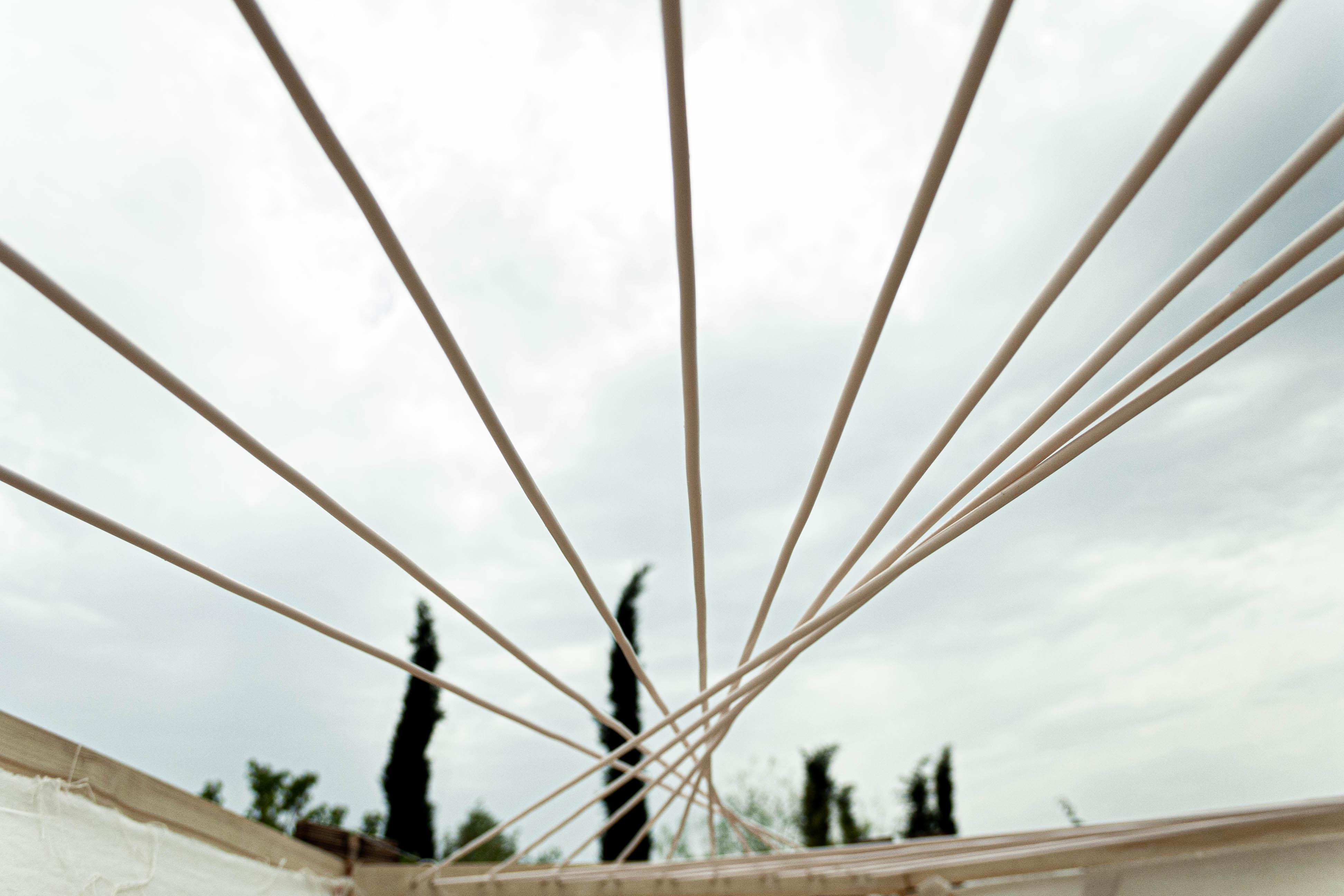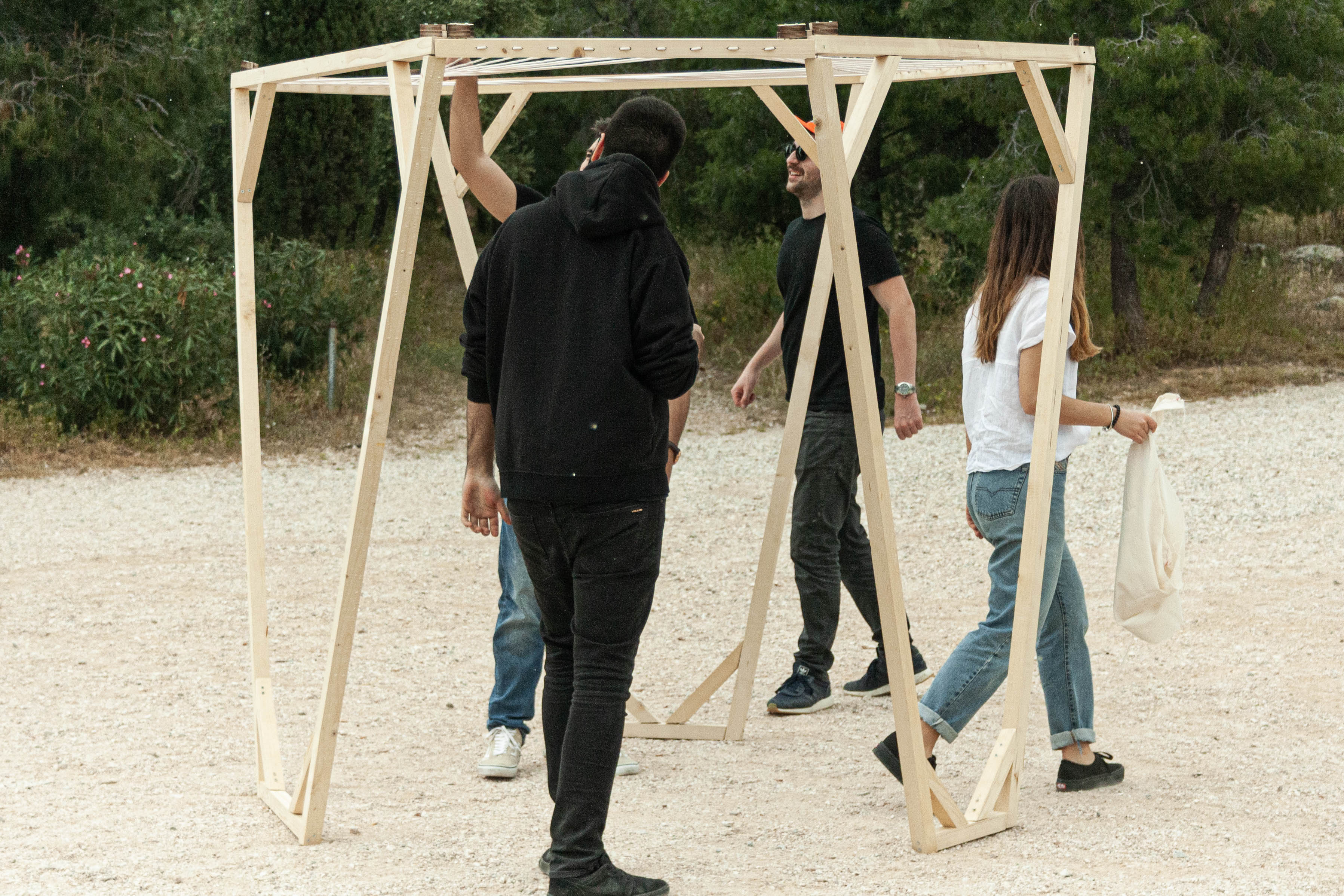 The final volume is constructed from trapezoidal shaped faces with triangular details. The inner space of a hexagonal top is crowned by a patio resulting from continuous fibre weaving, which are designed to differentiate shading of the structure due to the longitudinal edges of the yarn. As a whole, the construction combines numerous features to create a spatial matrix of social fusion of the different user groups of the paths.