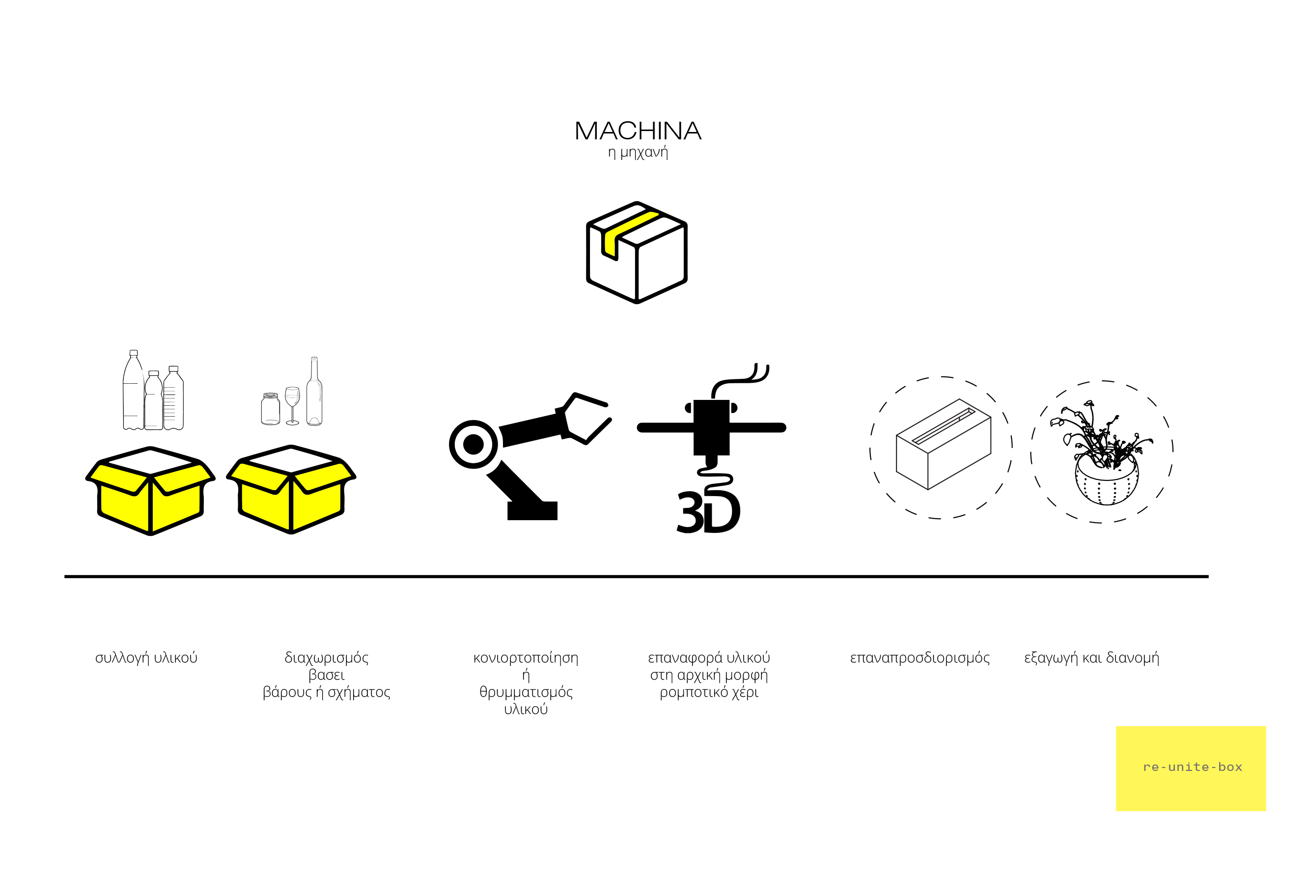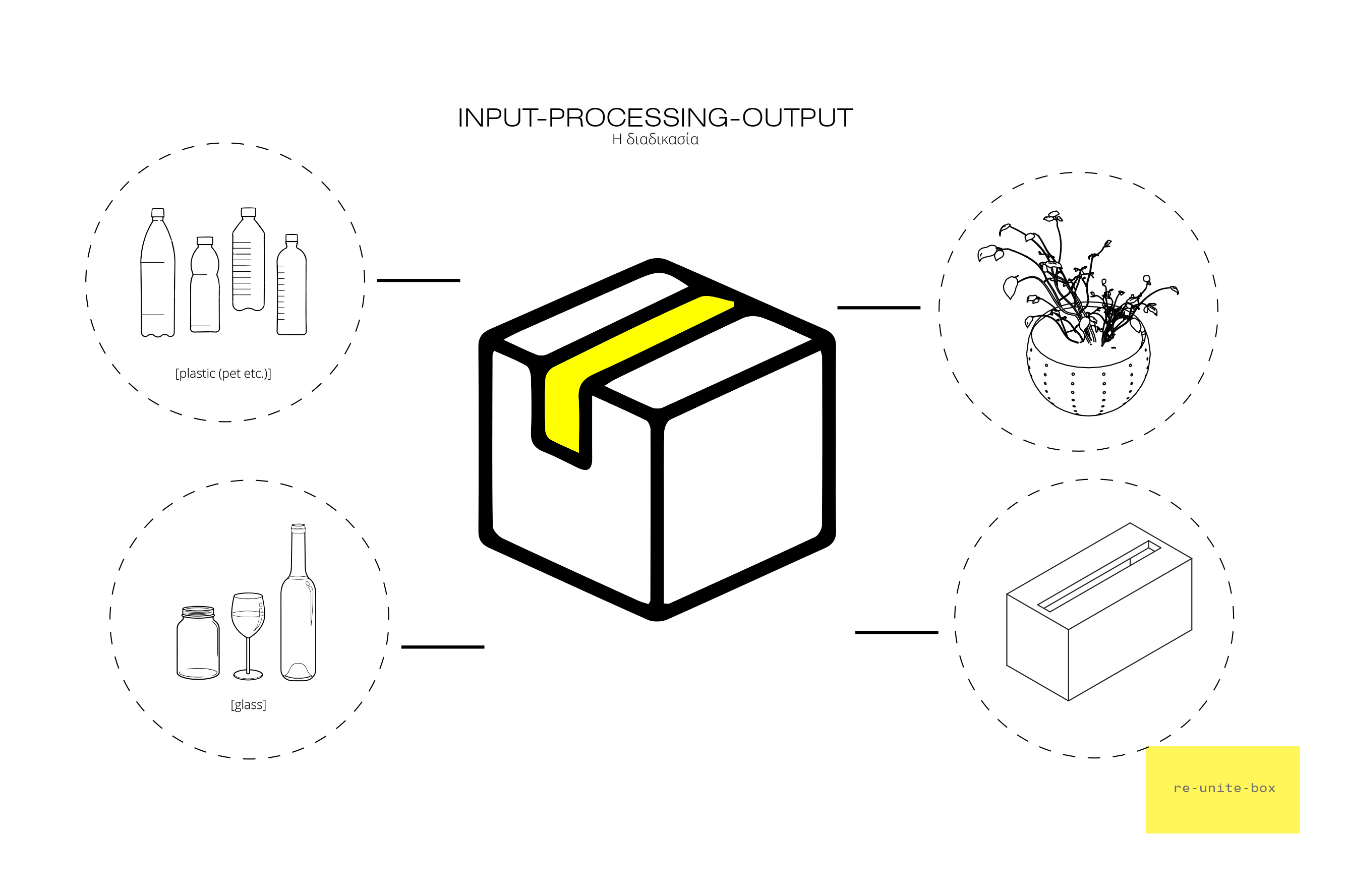 Η ιδέα είναι ένα installation που προσθέτουμε σε ένα "κουτί" που τοποθετείται σε ένα τετράγωνο ή στα κενά της γειτονιάς εν γένει. Οι άνθρωποι εισάγουν τα κύρια υλικά σε δύο διαφορετικά πλαίσια για κάθε υλικό. Έτσι αρχίζει η διαδικασία, τα υλικά μεταφέρονται στον τόπο της διαδικασίας έτσι ώστε να λειανθούν. Έτσι, μετατρέπονται σε μικρά κομμάτια έτσι ώστε να έχουν σχεδόν ίση συμπεριφορά. Στη συνέχεια μεταφέρονται στη διαδικασία σύντηξης εκεί, το υλικό επιστρέφει στην αρχική του κατάσταση. Στο τέλος αυτή η διαδικασία τελειώνει με μια εκλογή σε ποιο είδος προϊόντος κάθε γειτονιά απαιτεί. Αυτό, σε περίπτωση του πλαστικού, μπορεί να είναι μία γλάστρα για υδροπονικές χρήσεις ή πλαστικά δοχεία για γέμισμα με κονιάματα ή αδρανή υλικά και έτσι θα έχουμε ένα δομικό υλικό και μπορεί επίσης να συνδεθεί σε υλικό με τη χρήση 3d printer και έτσι μπορεί να γίνει ένα αντικείμενο που χρειάζονται οι άνθρωποι. Από την άλλη πλευρά, το γυαλί με τη χρήση καλουπιών μπορεί να μετατραπεί σε τούβλα ή κεραμίδια.