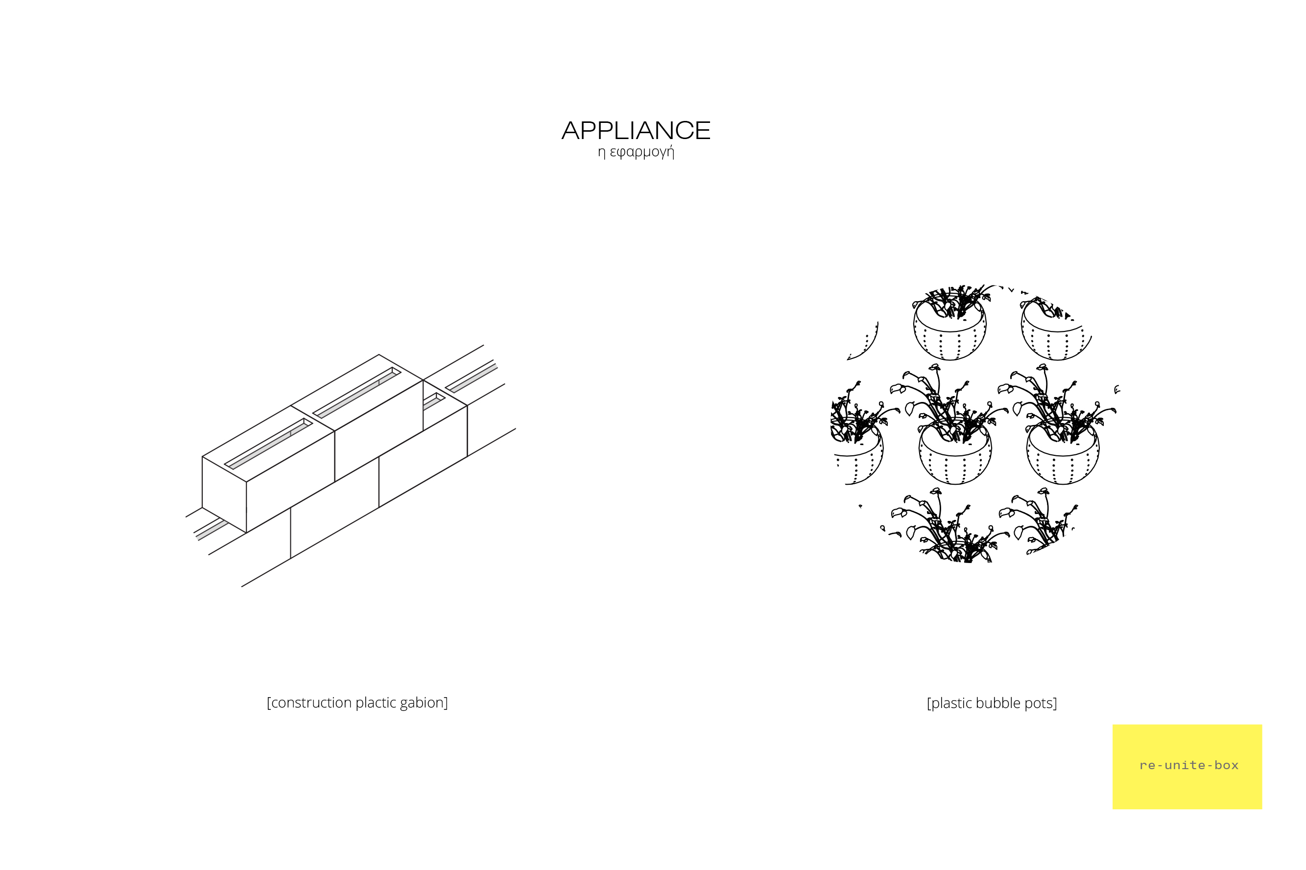 The idea is an installation that we add to a "box" that is placed to a square or to the gaps of the neighborhood in general. People import the main materials to two different boxes for each material. Thus the procedure starts, the materials are transported to the place of the procedure so that they get grinded. So are transformed into small pieces so that they have an almost equal behavior. Then they are transported to the fusion procedure there, the material is returned to its original state. In the end this procedure ends with an election to what type of product each neighborhood is needed. That, in case of plastic, can be a bubble pot for hydroponic uses, or plastic gabions for filling with mortars or inert materials and thus we will have a construction material, and it can also be connected in material by the use of 3d primer and thus it can become what useful object people need. On the other side glass with the use of molds can be transformed into bricks or tiles.
