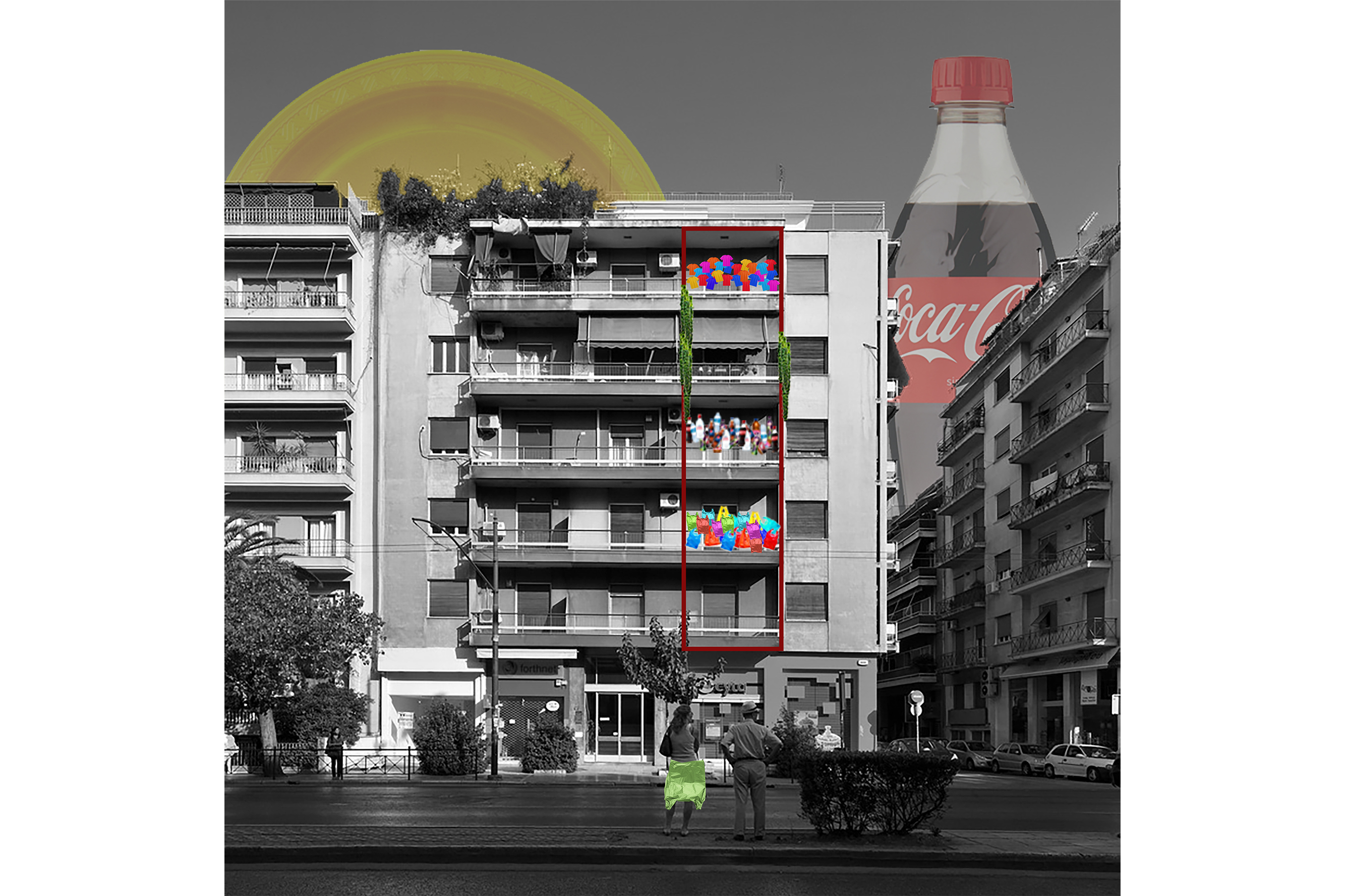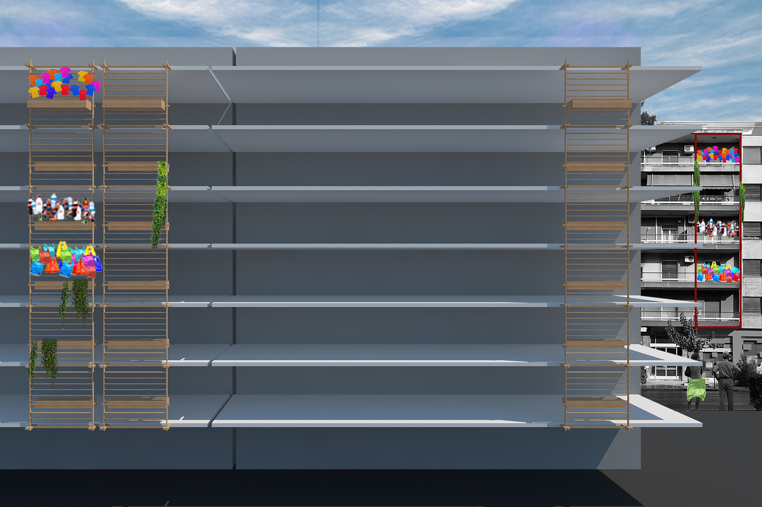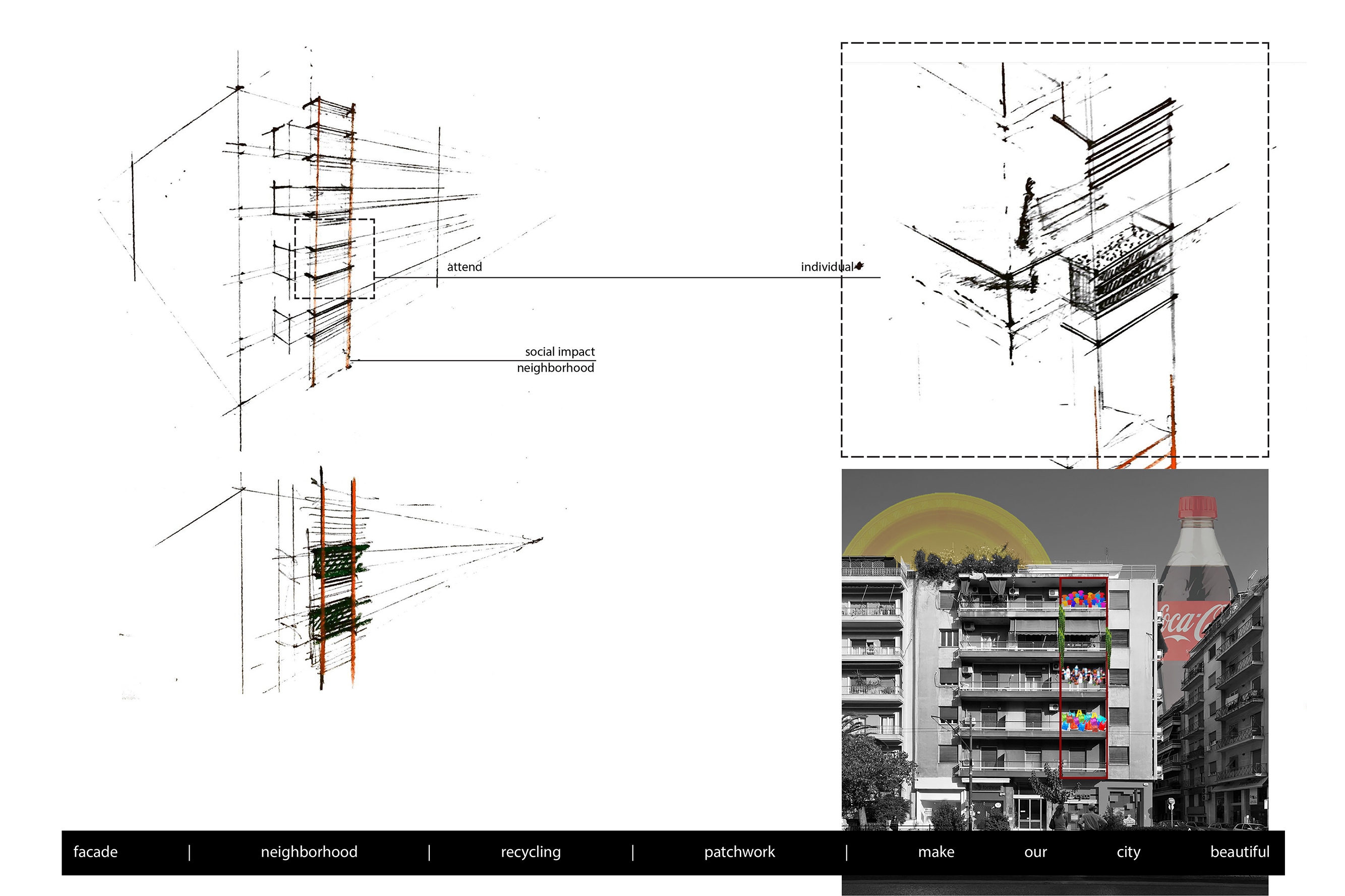Η πόλη της Αθήνας, πολλές φορές αποκτά μια αχανή εικόνα ενός δυσνόητου κολλάζ από πολυκατοικίες. Η πρότασή μας αφορά τη δημιουργία μίας ζώνης μεταβαλλόμενης όψης από τους κατοίκους της κάθε πολυκατοικίας(DIY). Πρόκειται για ένα απλό ξύλινο πλαίσιο-καμβά χωρισμένο σε ζώνες που μπορεί εύκολα να τοποθετηθεί σε κάποιο σημείο της όψης του κτιρίου. Δίνεται η δυνατότητα σε κάθε κάτοικο να οικειοποιηθεί τον χώρο του μέσα από τα δικά του αντικείμενα, ακόμα και απορρίμματα. Το πλαίσιο κατασκευάζεται από ξύλινες παλέτες, ενισχύοντας έτσι την έννοια της επανάχρησης, ενώ παράλληλα δημιουργούνται εσωτερικά πλαίσια ικανά να δημιουργήσουν τόσο χώρους κομποστοποίησης όσο και σημεία ανάρτησης. Οι αναρτήσεις αυτές ποικίλουν ανάλογα με την επιλογή του χρήστη, υφάσματα, μπουκάλια κλπ. Μπορεί να γίνεται χρήση αυτών των απορριμμάτων άλλοτε άμεση και άλλοτε υπό επεξεργασία.